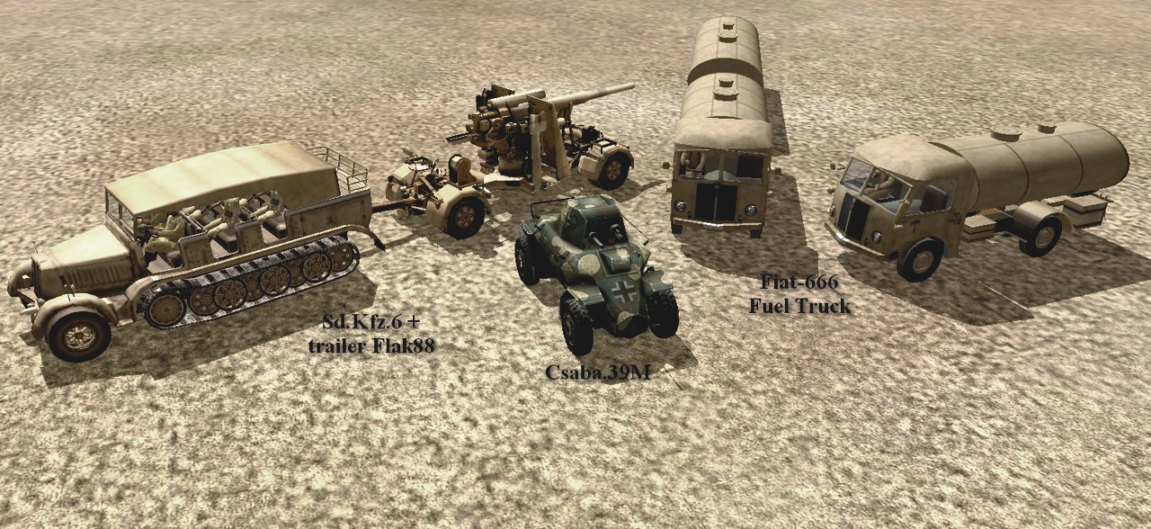 New Vehicles - Horch 901 - Csaba.39M - Mercedes L3000 - trailer Flak88 - Fiat-666 Fuel-Truck: