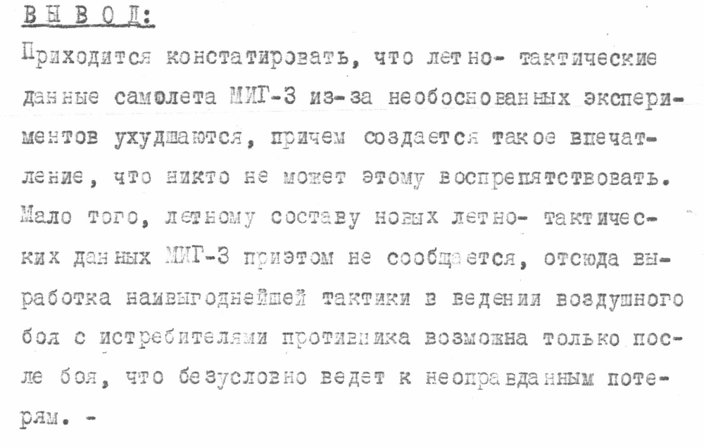 Ну да, при этом, в докладе командующему ВВС генерал-лейтенанту Жигареву от старшего инспектора-лётчика 2-го отдела 1 управления ГУ ВВС майора Шименаса А.И. об облёте четырёх серийных МиГ-3 прямо написано, что результаты заводских испытаний ни разу не совпадают с данными от НИИ, а в свою очередь, сами данные НИИ и завода №1 есть только рекордные. Вот такая вот петрушка, каким отчётам верить будем? %) Цитата: