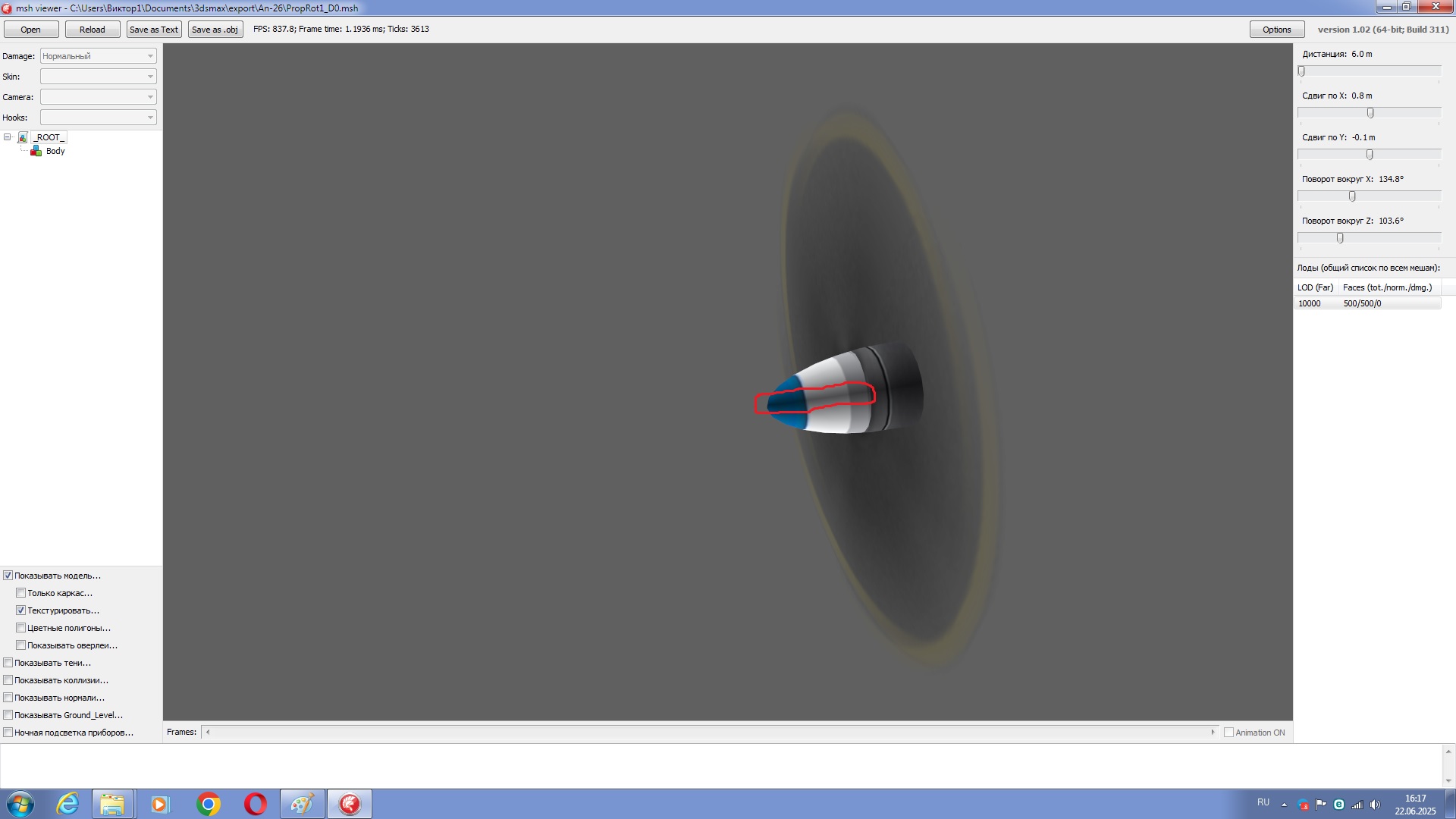 http://forum.aviaskins.com/attachmen...1&d=1750598798 Вот так обтекатели выглядят в игре при освещении сзади http://forum.aviaskins.com/attachmen...1&d=1750598932 Вот так - при освещении спереди http://forum.aviaskins.com/attachmen...1&d=1750599225 http://forum.aviaskins.com/attachmen...1&d=1750599225 Так - при освещении сбоку с разных сторон самолёта Причём светлые и тёмные области постоянно вращаются и меняют направление вращения в зависимости от оборотов винта. http://forum.aviaskins.com/attachmen...1&d=1750599471 Так выглядит меш в просмотровщике. Можно ли как то убрать эти ненужные эффекты? Пробовал при экспорте меша убрать галочки освещения в мараз экпортере - не помогло. Может в самом максе как то настроить освещение сцены? Поражает, что такая "бяка" вылезла только в одном меше именно роторе вращающегося винта. Все остальные меши отображаются корректно. Сам меш с материалами и текстурами и максовский файл во вложении. |