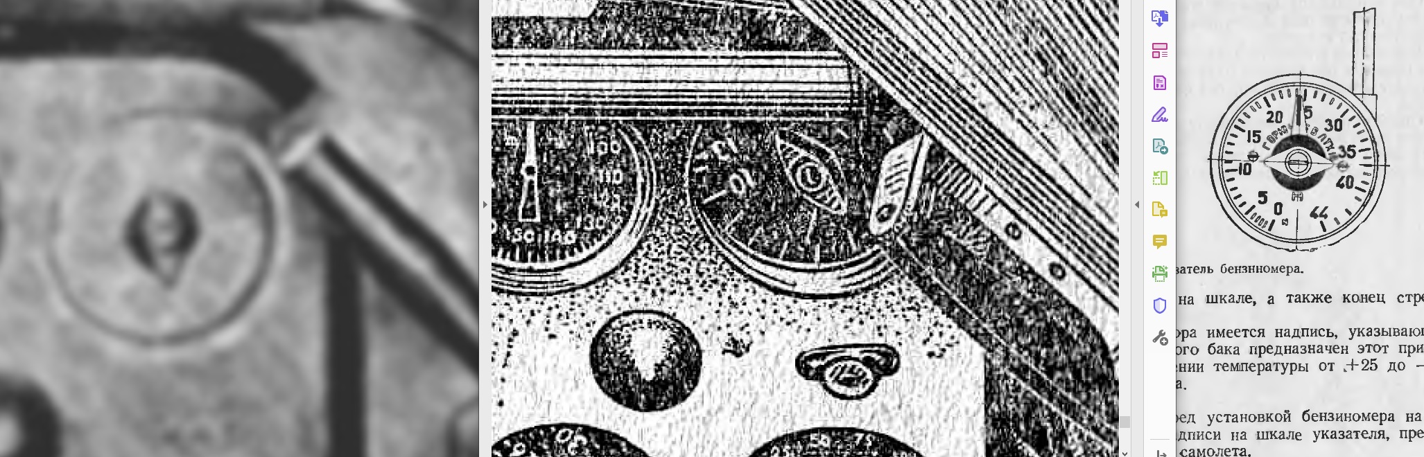 Так же новый раунд угадайки. Сейчас делаю кабины МиГ-1/МиГ-3. Интересует механический бензиномер "телевель". На коллаже: слева фотография МиГ-3, по центру картинка из ТО, справа похожий тип. В одной из книг по МиГ-3 этот прибор указан как "механический бензиномер 110 литров". 110 - нормальное показание данного прибора, т.е. шкала больше 110 литров размечена. Вот смотрю на шкалу и вижу только цифры 10 и 13, понять что за шкала не могу. http://forum.aviaskins.com/attachmen...1&d=1736276321 |