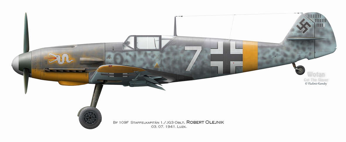 "С 28-м полком я и встретил первый день войны. Началось все это это интересно, неожиданно. Мы были в лагерях, часть летчиков отдыхали дома. Командир полка Осадчий, как раз за несколько дней ушел из полка. На рассвете, по тревоге звук которой позапустили и выключили, - думали обычная учебная тревога. Но потом, чувствую по настроению, что-то не то. Мечется Черкасов, подполковник (Новый командир полка - прим.Авт.), - "взлетать!" Первым со всего аэродрома я взлетел. Вылетела нас пятерка, сборная со всего полка, приказ нам дали идти к границе. Я еще понятия не имел что война. Прилетели на границу - все горит. Тут кое-что начал понимать. Впервые набрался смелости перелететь через границу. Полетали мы там, зашли поглубже. Походили по линии фронта. Видим, горит все подряд, очень много войск с обоих сторон. Шли напряженные бои. Я решил, что все это. - пограничный инцидент, сразу в голове не укладывалось, что началась война. Вернулись чтобы доложить об этом. Но на аэродроме уже знали, что не инцидент, а война. Дозаправились и снова взлетели для штурмовки вражеских войск. Но только успел набрать высоту 500 м как прошла атака Мессершмиттов. Я их сразу узнал, вижу - заходят на аэродром. А ведомые мои сначала не понял, кто это такие. Я оторвался от них, повернул самолет, а они уже гуськом цепочкой, заходят штурмовать аэродром. Я по первому не успел свалиться, но свалился по второму. И хорошо свалился, на пикировании на предельной скорости - аж в глазах темно -до самой земли, догнал его и угробил - он врезался в лес. Пулеметы у меня были замечательно обстреляны - самолеты МиГ-и мы только что получили и только-только ввели в строй, - все было новенькое. Но когда я стал выводить из пике, все на той-же огромной скорости, прямо мне в лоб сваливается их ведущий. Только я хотел очередь дать, как он по мне - из пушек, я понял на зарядные ящики. Свернул мне плоскость - дырочку сделал потом у меня снаряды взорвались. Машина неуправляемая. С грехом пополам сел..." Адьютант 3-й эскадрильи 28-го ИАП старший лейтенант Евгений Горбатюк http://f3.s.qip.ru/~7WXfJ19k.jpg Рассказ Горбатюка интересно сравнить с Рапортом о воздушной победе, подписанном фельдфебелем Хеесеном из 2/JG3, он бы в числе одиннадцати пилотов 1-го и 2-го штаффелей возглавляемых командиром 1/JG3 оберлейтенантом Р.Олейником, которые и атаковали аэродром Чунев: "22.6.1941 в 03:35 я стартовал в паре Bf 109 с бомбами в звене оберлейтенанта Олейника. Через полчаса летного времени мы заметили у Grodek одиночную машину. Оберлейтенант Олейник развернулся на нее и приказал мне сбросить бомбы на аэродром Grodek. Пикируя, я видел стартующие с аэродрома машины. Я сбросил бомбы, прицелился в заднюю машину и поджег ее очередью. Заваливаясь на левое крыло, она начала падать, а пилот выпрыгнул с парашютом. Я не мог наблюдать, как она упала на землю, так как отвернул, заметив, что остальные машины разворачиваются на боевой курс в мою сторону." Командир 1/JG3 Оберлейтенант Роберт Олейник. http://f2.s.qip.ru/~7WXfJ19m.jpg Вот теперь имея данные обоих сторон мы можем примерно понять как начался бой. Не только Горбатюк заметил противника, немцы судя по всему именно его МиГ-3 идентифицировали как "одиночную машину". Горбатюк очевидно смог развернуться и попытался помешать немецкой атаке, но видимо когда он спикировал на заходящие в атаку немецкие штурмовики, его на встречном курсе перехватил оберлейтенант