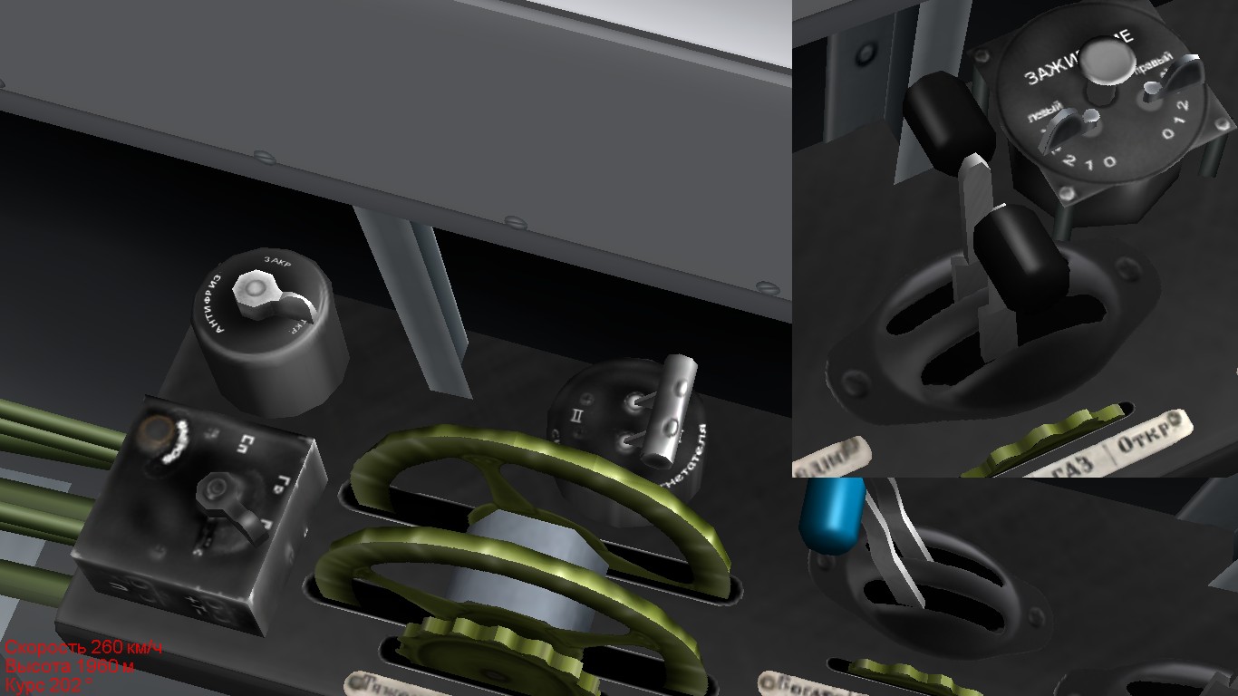 Приступил к облагораживанию левого пульта пилота. Добавил анимацию тумблера нагнетателя. Поправил переключатели магнето и антифриза, колёсики фрикционных тормозов и штурвальчик шага винта. Проложил тяги по борту заново. Таблички с надписями почистил.