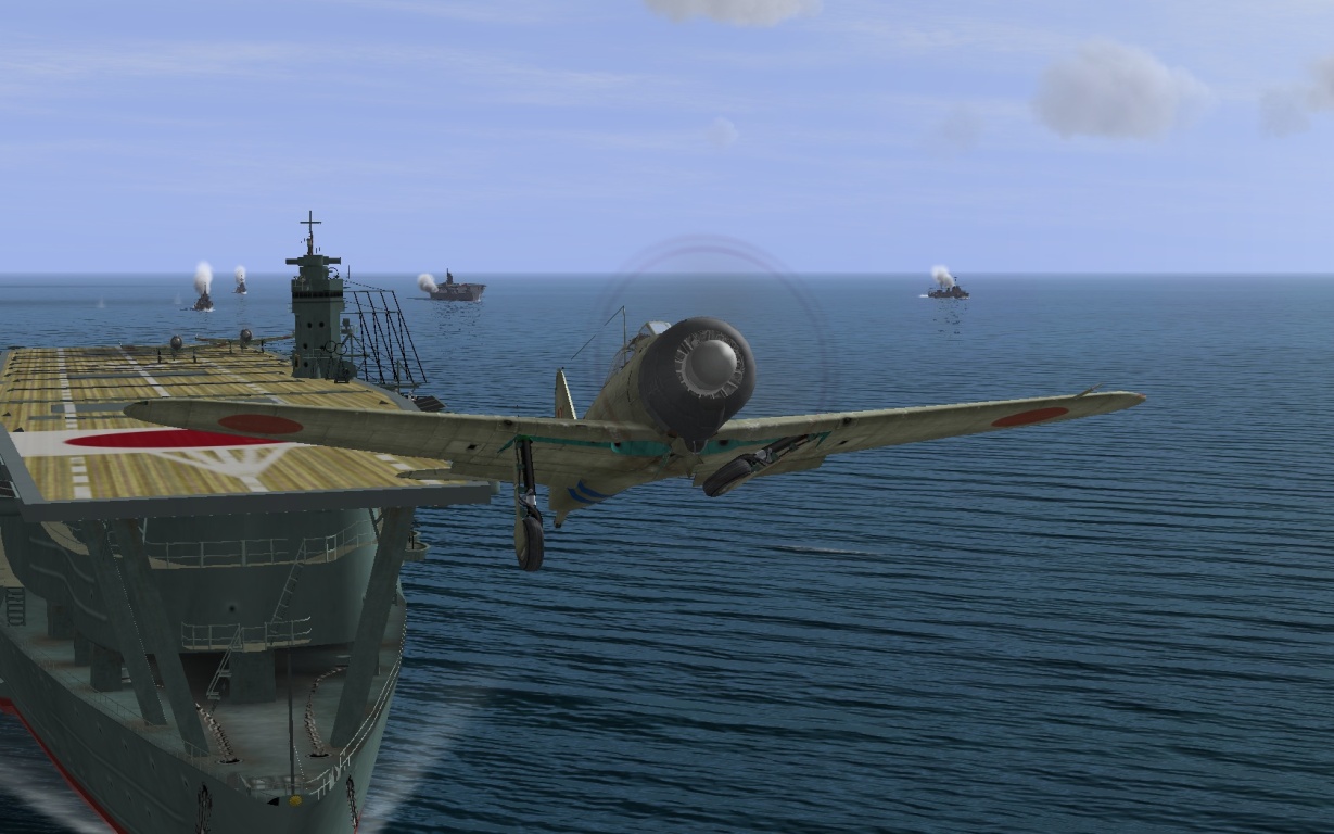 Скрины сражения у Мидуэя: SBD направляются к японскому флоту, Зеро взлетает на перехват, американское оперативное соединение: