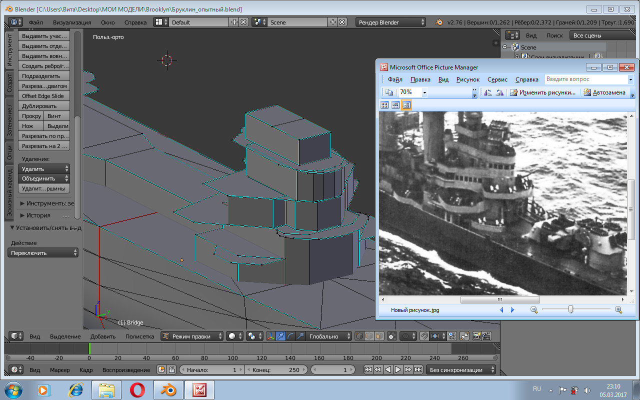 По фотографиям несколько изменил очертания носовой надстройки. По этому фото датированным 11 июня 1943 г. можно определить приблизительное количество зенитной артиллерии, я насчитал 26 эрликонов и четыре четырех ствольных бофорса. А где ещё 4 двуствольных бофорса? А их нет и видимо не было. По крайней мере мной не найдено ни одной схемы с "стандартным вооружением". Может у кого то есть более полная информация? А пока переполовинив модель работаю над текстурами. Всем мира.