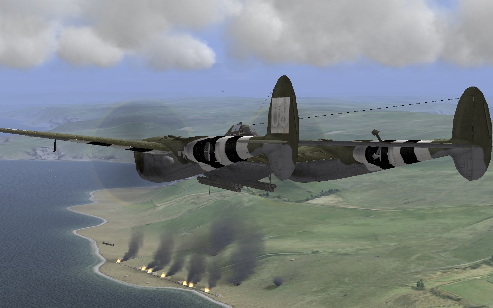Скриншоты: самолеты 9-х ВВС атакуют немецкую береговую батарею Кап де-Ля-Хаг, накануне штурма важного порта Шербург.