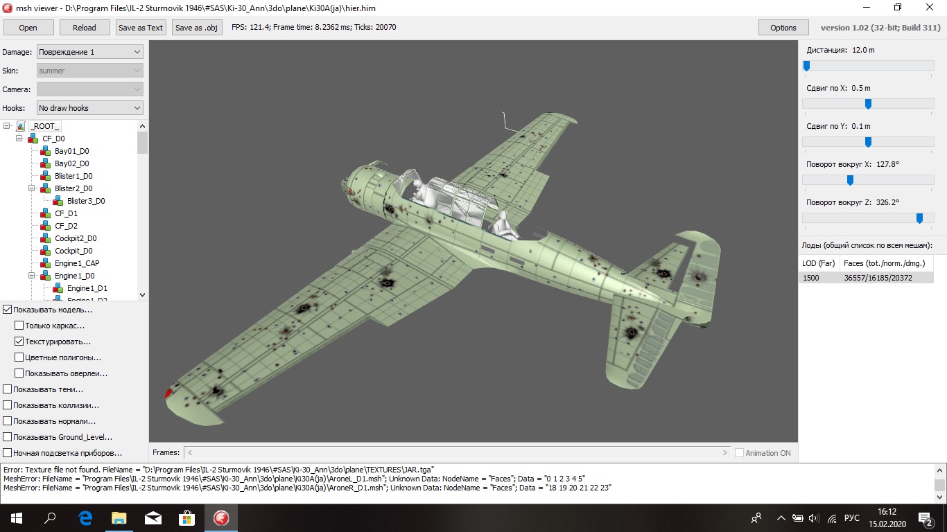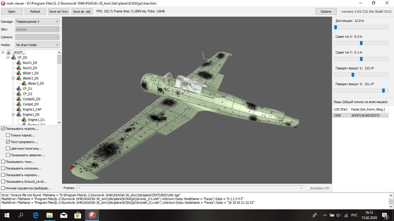Жизнь берет своё, по этому работа идет медленнее чем хотелось бы. За последнее время добавил оверлеев и повреждений пока без альфы. Исправил неправильное "отзеркаленное" положение номера на руле направления. Большая же часть времени была безуспешно потрачена на попытки нарисовать нормальный скин. К сожалению ничего хорошего не получилось, буду заниматься плагиатом. Всплыли очередные вопросы и непонятности. Почему то огнем зениток не повреждаются крылья, причем прицельным огнем истребителя их таки повредить можно. Не понятно куда должны быть направлены векторы направления огня из бензобаков и дыма из поврежденного двигателя. Странно, но бензобак может загореться при внешне не поврежденном крыле...