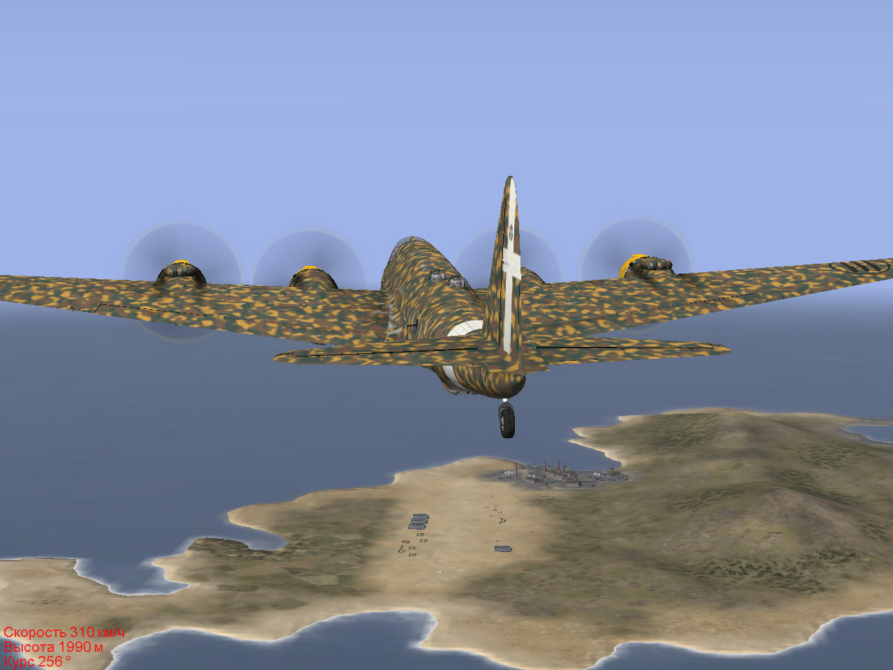 Задача: Вы ведущий пары Р.108. Аэродром Дечикоманна окружен высокими холмами – будьте очень внимательны при взлете и, особенно, при посадке! При взлете сразу начинайте плавный набор высоты, но внимательно следите за скоростью, не допускайте ее снижения ниже 190 км/час! Маршрут полета к цели указан в полетной карте, эшелон полета на маршруте 1500 - 2000 м, погода на маршруте – ПМУ. Вас сопровождает пара истребителей МС. 202. На подходе к аэродрому Та-Кали (остров Мальта) возможна встреча с английскими истребителями – будьте очень внимательны! Бомбометание произвести с высоты не менее 2000 м - пво аэродрома имеет малокалиберную зенитную артиллерию. Вашими целями являются стоянки бомбардировщиков Веллингтон и склады ГСМ, сделайте 2-3 захода на цель.