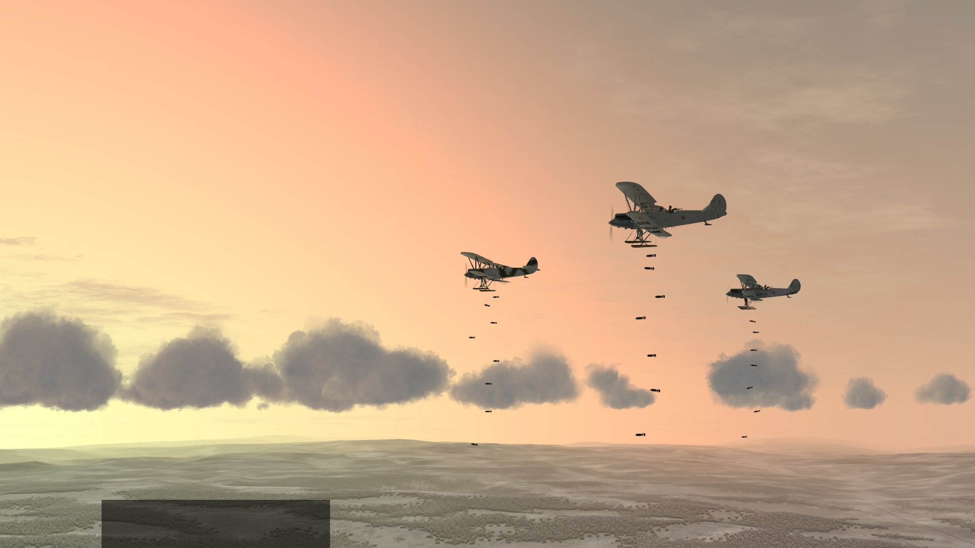 отсюда. Переделки минимальные. Немного изменена "наземка" в районе цели. Брифинг слегка изменён, чтоб конкретизировать задачу бомбардировщикам. Добавил один Р-5 до полного звена. Ну и поскольку в оригинальной миссии они стартуют в воздухе, пришлось немного подкрутить время и точки старта для других самолётов чтобы дать игроку время взлететь и набрать высоту на о-очень тихоходной машине. Проставил во всех точках галку "радиомолчание", так что подтверждения получения команд от ведомых слышно не будет.