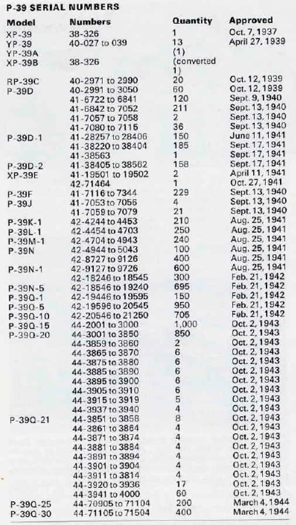 Есть 2 вида табличек, прямоугольные и со скруглением. Не ясно по какой логике ставили прямоугольные и скруглённые таблички. Прямоугольная табличка стоит на музейном P-39Q-15, на фотографии из американского руководства к P-39K-1/L-1 и в советском руководстве P-39N-5. Фотографии этих табличек не чёткие, не видно что написано (так даже легче). Скруглённые таблички уже чёткие, на них видно что написано. Где-то написана модель не полностью, то есть тире, то нет (P-39N и P39-N-0). Где-то написан номер двигателя (13920), где-то его модель (V-1710-85). Где-то написан сквозной номер самолёта в ВВС США (41-28382), где-то заводской номер (26E39). Вопросов больше, чем ответов.