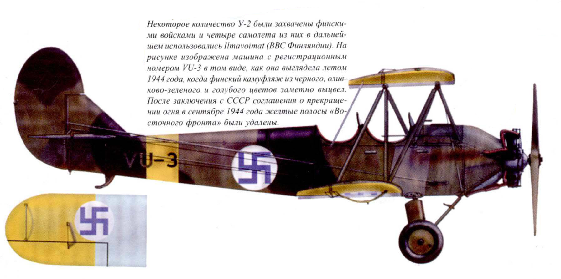 У-2 используемый финнами. Приблизительная окраска. Точной информации о форме камуфляжных пятен на верхних поверхностях этого самолёта нет.