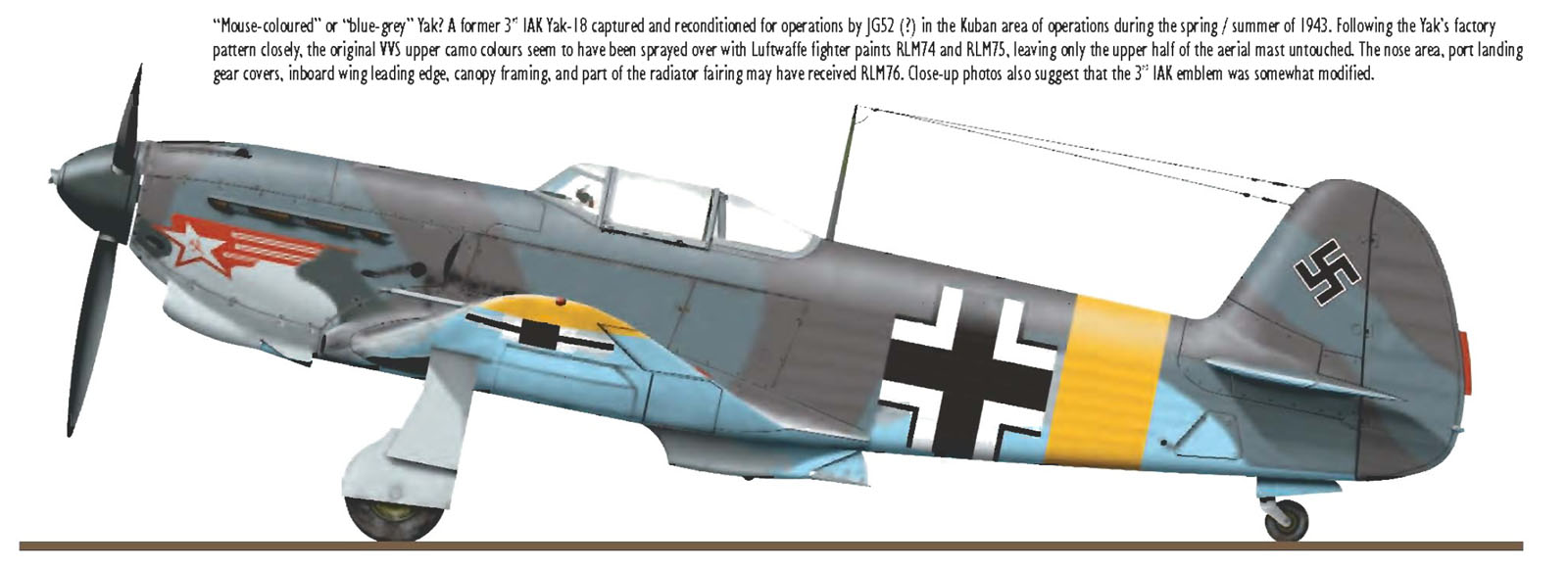 Конкретно по этому яшке - камуфло стандартное черно-зеленое, на морде нижняя граница голубого задрана вверх, эмблема 3-го ИАК на морде. Звезды закрашены, поверх них немецкие ОЗ (на верхней поверхности крыла скорее всего тоже), желтые законцовки крыльев снизу плюс очень вероятна желтая полоса на физеле перед килем. Примерно так