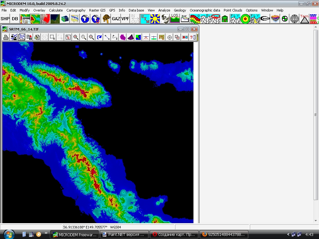 Попробуем работать с Микродем. Note's: программу следует ставить только на системный диск, сохраняя тот путь, который она хочет по умолчанию (C:/Microdem у меня). Для ее функционирования требуется также BDE-пакет, который входит в инсталлятор full-версии - там на странице издателя проги есть разные по весу инсталляторы. Берете самый укомплектованый. Перед запуском программы нам надо кинуть по адресу С:\microdem файл 1 ELEV_COLORS - corrected v7.dbf, который я прикрепил к посту. Пошагово в картинках (если плохо видно - откройте рисунки в новой вкладке) Открываем программу -> жмем кнопку Open DEM ->выбираем наш .tif Несколько секунд программа рассчитывает модель карты и показывает нам ее в стандартном разрешении.