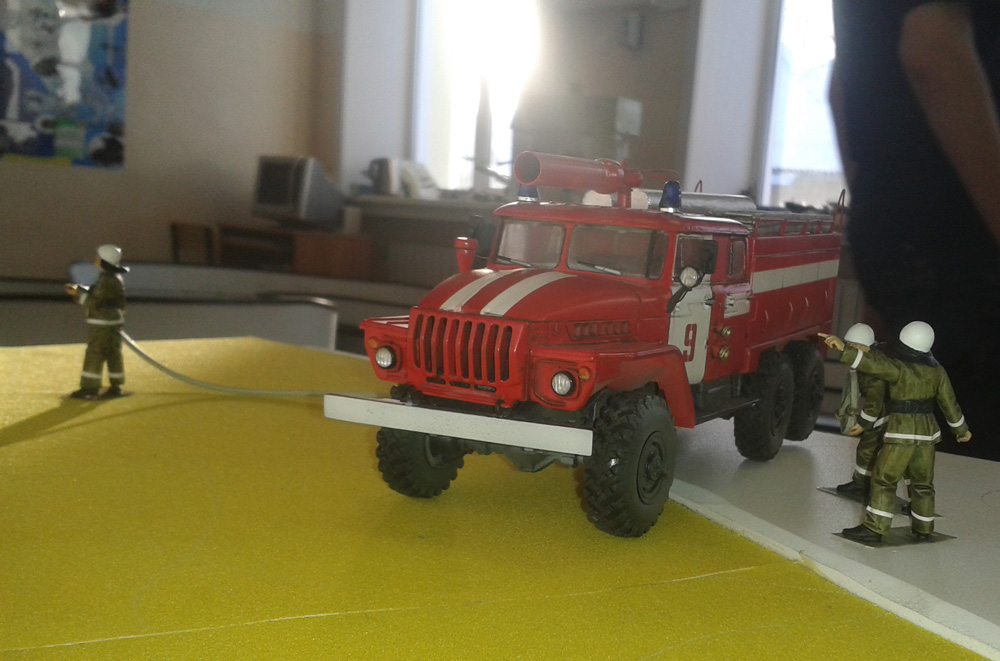 площадь диорамы ограничена. Урал+пожарный расчет займет львиную долю пространства. на пятачке встанет УАЗ-452 от МЧС, вот и все, там еще пара тройка фигур.