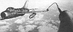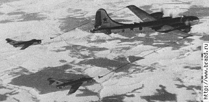 Хвостовая часть Ту-4, входившего в систему "Бурлаки", до и после переделки для дозаправкиМиГ-15бис во время буксировки за Ту-4 и наземных испытаний системы "Бурлаки" Для дальнейшей модернизации взяли по одному Ту-4 и МиГ-15. ОКБ-30 установило систему передачи топлива на Ту-4 (№1840848), а ОКБ Яковлева - систему его приема на МиГ-15бис (№2215304). Система оказалась очень сложной, так как с элементами уже имеющегося комплекса совместили новый. Самолеты сцеплялись по методике "Бурлаков", а затем вдоль буксировочного троса подавался шланг с дополнительным конусом под штангутопливоприемника, совмещенную с гарпуном. Испытания этой системы дозаправки продолжались с 24 сентября 1954 г. по 2 марта 1955 г. МиГ пилотировал Анохин, танкер - Ефимов. Было выполнено пять контактов на высотах 2000 и 4000 м, и в трех из них перекачивалось топливо. Эксперимент на высоте 8500 м окончился неудачей - резиновые детали наружных узлов системы замерзли, потеряли эластичность и стыковка не состоялась. Как видим, первые советские работы по дозаправке в воздухе проводили либо группы энтузиастов (Шелест и Васятин), либо ОКБ, имевшие и без того очень высокую загрузку (Туполева, Яковлева и Микояна). В декабре 1952 г. за дело взялся еще один коллектив - ОКБ-918. Сегодня эта фирма называется "Звезда" и является единственной в России, работающей по данной тематике. Новому ОКБ, созданному на базе ЛИИ, поручалась разработка катапультируемых кресел, шлемов, скафандров и прочего снаряжения для жизнеобеспечения экипажей, а также комплексов дозаправки в воздухе. Первым его главным конструктором стал Семен Алексеев (во время второй мировой войны - заместитель С.А.Лавочкина, а после нее - координатор работ немецких авиаконструкторов на территории СССР). С 1964 г. и поныне "Звездой" руководит Гай Северин. Первым заданием отдела, занимавшегося в ОКБ-918 средствами дозаправки в воздухе, стала работа по передаче топлива двум Ми Г-15 от танкера Ту-4. Она досталась по наследству от группы Вахмистрова, специалисты которой почти в полном составе влились в новый коллектив. Эта система стала первой в СССР, изначально созданной по схеме "конус-штанга". Возможности танкера расширились: вместо одной заправочной точки в хвостовой части фюзеляжа на нем оборудовали две на законцовках крыла. В отличие от комплекса Яковлева, полученного доработкой "Бурлаков", в системе Вахмистрова заправочная точка была значительно проще: только один конус и только один "трос" - топливный шланг. МиГ-15бис во время наземных испытаний комплекса дозаправки, созданного на основе системы "Бурлаки" Перед дозаправкой оператор, сидящий в кабине кормового стрелка Ту-4, выпускал два шланга с конусами на концах. Истребители подходили к конусам и проводили сцепку, после чего топливные насосы подавали керосин. Между летчиками истребителей и оператором имелась радиосвязь. По окончании процедуры МиГи тормозились и штанги "выскакивали" из конусов. Летные испытания этой системы начались в 1953 г. Истребители пилотировали Анохин и Пронякин. Эксперименты дали очень обнадеживающие результаты и позволили более широко взглянуть на весь комплекс проблем дозаправки в воздухе. Стало ясно, что для разработки более совершенной системы прежде всего необходимо создать радиоаппаратуру, обеспечивающую эффективный поиск и наведение танкера и дозаправляемых самолетов дру