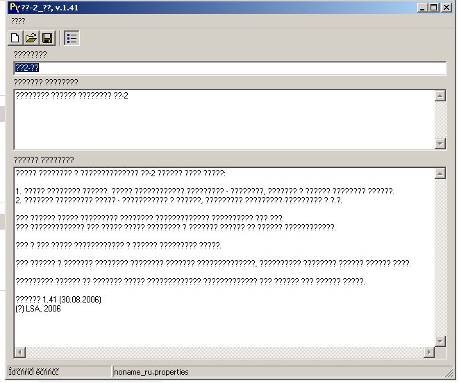 А какие проблемы ? Надписи на кнопках коряво отображаются ? Не работает совсем ? 1. В левую часть окна вставить нужный русский текст 2. нажать среднюю кнопку "Преобразовать"(RECODE) 3. В правой части окна получить перекодированный текст 4. сохранить текст нажав кнопку"Сохранить"(SAVE) Вот картинку можно посмотреть где текст переведен: