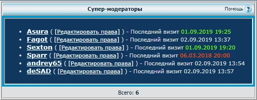 Смешно даже список модеров смотреть: Big-B - последнее сообщение 18.03.2019, 00:44 Последняя активность: 04.08.2019 03:21 Sparr - Последняя активность: 07.03.2018 00:00 Myshlayevsky - Последняя активность: 07.11.2014 12:18 Fagot - сообщений всего на форуме 22, в 10 году, потом в 15, потом в этом несколько. berkac - Последняя активность: 17.04.2019 20:28 |