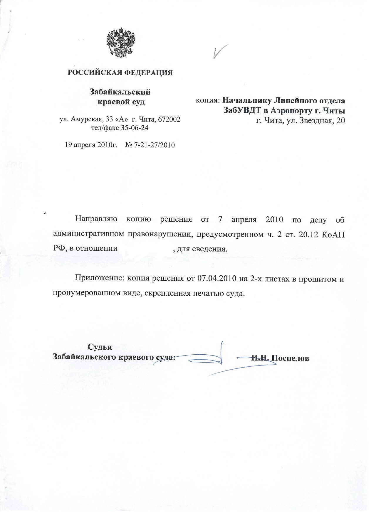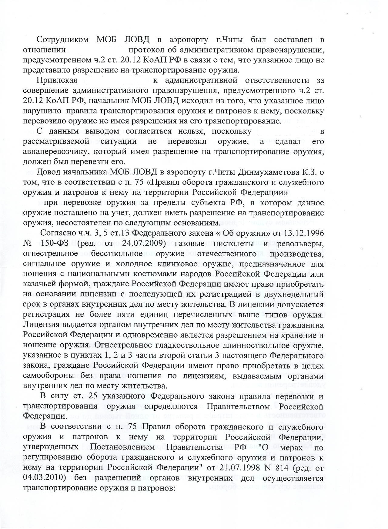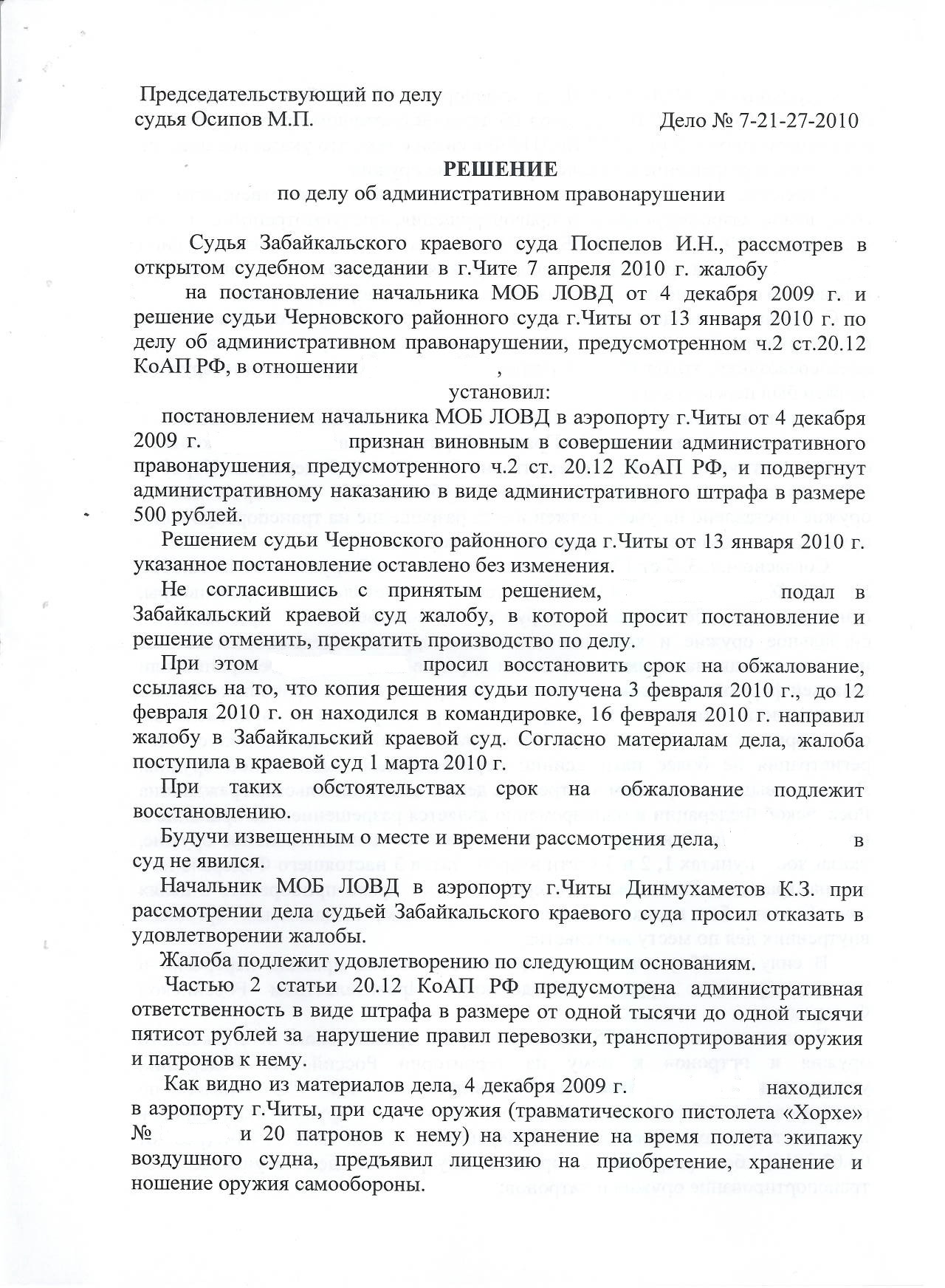 В __________ районный суд г. Москвы от __________________ проживающего по адресу: ________________________________ Ж А Л О Б А На постановление № ________ по делу об административном правонарушении ответственность за совершение которого предусмотрена ч. 5 ст. 12.16 КоАП РФ. Постановлением №7_________ от 17.07.2013 вынесенным инспектором ЦАФАП ОДД ГИБДД ГУ МВД России по г. Москве лейтенантом полиции _____________________, я подвергнут административному взысканию в виде административного штрафа в сумме 3000 рублей, за нарушение требований знака п. 3.27 приложения 1 к Правилам Дорожного Движения Российской Федерации. Постановление №____________ от 17.07.2013 вынесено на основании данных фотосъемки со средства фиксации административных правонарушений, имеющего функцию фотосъемки: ПаркРайт, заводской номер ______, свидетельство о проверке №_____, протокол об административном правонарушении при этом не составлялся, а постановление по делу об административном правонарушении было вынесено без моего участия. Постановление №_____ от 17.07.2013 было получено мной 29.07.2013г. по почте, в виде простого почтового отправления без уведомления о вручении. Ознакомившись лишь 29 июля 2013 с указанным постановлением №_______ от 17.07.2013, то есть спустя 12 дней с момента его вынесения, я выражаю возражение по сути административного правонарушения вменяемого мне в вину, а также выражаю свое несогласие с его содержанием по ниже следующим основаниям: Как указано в постановлении №_________ от 17.07.2013 я привлечен к административной ответственности на основании данных фотосъемки со средства фиксации административных правонарушений, имеющего функцию фотосъемки за нарушение требований знака п. 3.27 приложения 1 к Правилам Дорожного Движения Российской Федерации, что позволило должностному лицу рассматривающему дело об административном правонарушении привлечь меня к ответственности за совершение административного правонарушения, ответственность за которое предусмотрена ч. 5 ст. 12.16 (Несоблюдение требований, предписанных дорожными знаками или разметкой проезжей части дороги, запрещающими остановку или стоянку транспортных средств совершенное в городе федерального значения Москве или Санкт-Петербурге). На фотоснимке предоставленном должностному лицу рассматривающему дело об административном правонарушении якобы отчетливо запечатлевшем момент совершения административного правонарушения совершенного мной, отсутствуют доказательства совершенного мной административного правонарушения, а именно: На снимке с камеры фиксации административных правонарушений отчетливо виден автомобиль припаркованный мной, вне зоны действия запрещающего знака, а также дорожной разметки устанавливающей запрет остановки в месте парковки моего автомобиля. Считаю, что при таких обстоятельствах вынесение постановления о назначении административного правонарушения и без составления протокола, а также без моего участия было невозможным, так как при этом были явно нарушены мои права на защиту, а также был нарушен принцип презумпции невиновности установленный статьей 1.5 КоАП РФ, так как в данном конкретном случае установить вину не основании информации предоставленной ПаркРайт, заводской номер ___ не предоставляется возможным В соответствии с ч. 1 ст. 24.1 КоАП РФ, задачами производства по делам об административных правонарушениях являются всесторон