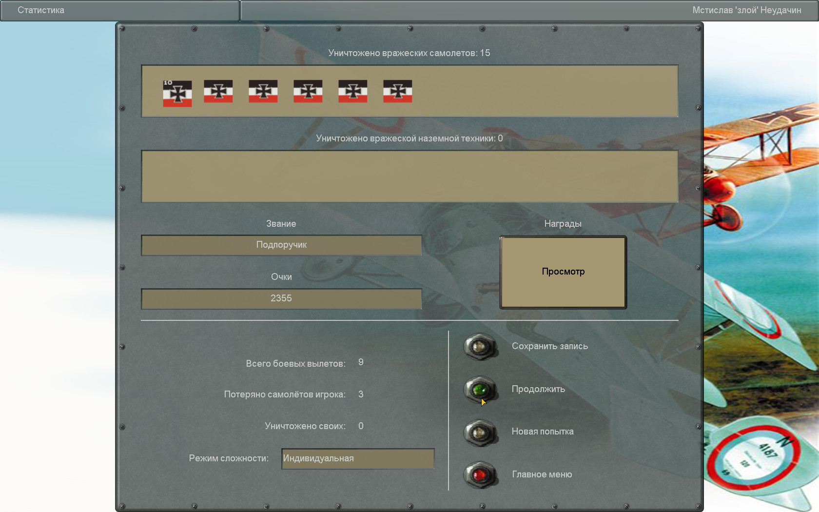 Статическая компания летчика истребительной авиации, участника Первой Мировой войны. Игроку предстоит пройти эту кампанию от имени главного героя русского летчика прапорщика Самсонова. Исторической привязки к событиям нет, скины даны, для самолетов 3 БАГ 1,11,22 КАО. Развитие событий в периуд с осени 1916г и по лето 1917г. Предназначается для версии игры 4.101m + MODS "ИЛ-2 Штурмовик. Забытые сражения". Делал на сборке HSFX 5.1, но с учетом DBW 1.71+DBW_1916_update_v1beta5 Прохождение кампании рекомендуется начинать в звании - Прапорщик Уровень сложности - любой Также настоятельно рекомендуется в настройках отключить - функцию "выполнение задания", функцию "маршрут на карте" отключать не рекомендуется. разработчики: Мстислав Неудачин - начпрод (автор идеи, миссии, подбор материала, подборка и создание вариантов окрасок самолетов противоборствующих сторон) ссылки на моды: Nieuport 11 http://www.sas1946.com/main/index.ph...c,27969.0.html Aviatik CI/III S.A.M.L.s1/s2 http://www.sas1946.com/main/index.ph...c,28239.0.html НеДеХевеленды-Ньюпоры http://dispersalfield.ru/main/index.php/topic,43.0.html машины http://www.sas1946.com/main/index.ph...26088.432.html Пушка на бочке! http://dispersalfield.ru/main/index.php/topic,50.0.html Friedrichshafen G.III for DBW1916 - BETA от western0221 http://www.sas1946.com/main/index.ph...,28520.36.html Fokker E III http://www.sas1946.com/main/index.ph...c,28413.0.html DBW-1916 - решает все проблемы http://www.sas1946.com/main/index.ph...c,26088.0.html ссылки на скины: http://forum.aviaskins.com/showpost....03&postcount=9 http://forum.aviaskins.com/showpost....97&postcount=8 http://forum.aviaskins.com/showpost....80&postcount=2 http://forum.aviaskins.com/showpost....98&postcount=8 http://forum.aviaskins.com/showpost....99&postcount=9 http://forum.aviaskins.com/showpost....0&postcount=10 статика: http://narod.ru/disk/64592588001.770...D1%81.rar.html и ссылка на саму компанию, приятных полетов! http://narod.ru/disk/64591010001.c62....htmlБлагодарю Канта и wcat1973 за помощь в тестировании компании, а так же Skvorezа, за моральную поддержку. Последний раз редактировалось начпрод; 18.12.2012 в 16:53. |
