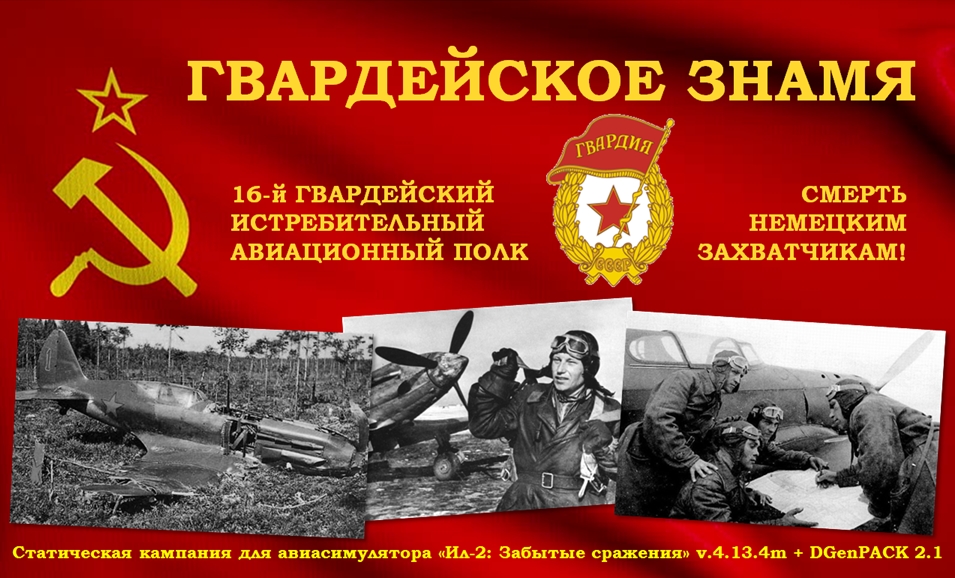 ...Первая передышка за четыре месяца кровопролитной войны... Позади - горечь потерь, позор отступления, отчаяние от собственного бессилия перед мощной военной машиной врага... Впереди - возможность перевести дух, осмыслить полученный боевой опыт, хотя бы частично восполнить потери матчасти и попытаться обучить новичков из молодого пополнения. Провести "перегруппировку" собственных физических и моральных сил, чтобы продолжить войну, зная, КАК надо воевать, и КАК можно побеждать. Чтобы, воюя по-новому, увидеть, что мы можем не только отступать, но и гнать врага с нашей земли. Чтобы стать примером мужества и доблести для других и одними из первых в ВВС РККА получить наивысший символ признания боевых заслуг - Гвардейское Знамя. Именно этому периоду боевого пути 55-го ИАП, будущего 16-го гвардейского истребительного авиационного Сандомирского ордена Александра Невского полка посвящена предлагаемая кампания. Версия игры: 4.13.4m + DGenPACK 2.1 Системные требования: тактовая частота процессора – от 2 ГГц, ОЗУ от 2 ГБ. Путь установки: по ссылке http://www.mediafire.com/file/5tuwds...K_2-1.rar/file скачать архив 55IAP-16GvIAP_campaign_DGenPACK 2-1.rar размером 131,52 МВ и распаковать его в папку корневого каталога игры с согласием на замену одноименных файлов. В результате в меню «Карьера» за СССР (ВВС РККА) будет доступна кампания «ГВАРДЕЙСКОЕ ЗНАМЯ». Продолжительность кампании: 26 миссий, 2 ч/б ролика Самолёты игрока: МиГ-3, И-16, Як-1. Карты: Донбасс (осень, зима, лето) от Oknevas. Рекомендуемое воинское звание: наивысшее в табели о рангах (для возможности командовать парой, звеном или группой). Рекомендуемый режим сложности: любой на усмотрение игрока. Опцию "ВЫПОЛНЕНИЕ ЗАДАНИЯ" настоятельно рекомендуется отключить Неизбежные упрощения и отступления от реальности: 1) Достоверных фото самолетов 55-го ИАП и 16-го ГвИАП, достаточно информативных для создания полностью исторических схем окраски в доступных информационных источниках найти не удалось. Пришлось ориентироваться на фрагментарные фотографии, совпадающие с ними боковики и воспоминания участников боевых действий. Таким образом, большинство схем окраски советских самолетов, используемых в кампании, являются предполагаемыми. 2) Поскольку на игровой карте Донбасса есть не все аэродромы базирования 55-го ИАП и 16-го ГвИАП, при создании миссий использовались ближайшие из имеющихся на карте. Особые указания: 1. Не забывайте, заново входя в игру после перерыва, каждый раз в меню проверять схему окраски самолета игрока: с версии 4.11 она сохраняется в настройках не так долго, как раньше, и часто-густо самопроизвольно заменяется на дефолтную. 2. Если в ходе прохождения какой-либо из миссий кампании Вы начали запись полета, не забудьте выключить ее перед завершением миссии. В противном случае Вам засчитают потерю самолета, даже если он абсолютно цел (баг игры, появившийся в версии 4.11 и до сих пор не исправленный). 3. Командуя парой или звеном самолетов, управляемых ИИ, не забудьте после взлета на несколько секунд включить, а затем выключить режим автопилота. Это своеобразный «пароль» для ботов, помогающий добиться их адекватной реакции на последующие команды игрока. ВАЖНАЯ ИНФОРМАЦИЯ по пользованию AircraftSelector’ом в ходе прохождения кампании Если Ваш ПК достаточно сильный, и прохождение карьеры не сопровождается фризами, тормозами, падением FPS, необходимости в и