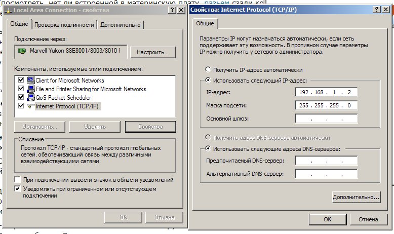 На одном, старом у сына сетевая карта PCI 10/100M 32Bit FNC-0109TX, у меня материнка Asus P5E64 WS Evolution <Socket775 <X48> 4xPCI-E+2xGbLAN+1394 SATA RAID U133 ATX 4DDR-III<PC3-12800>> С двумя сетевыми картам, одна собственно в интернет подключена, а другую решил использовать для подсоединения с компом сына. Подключением занимался сын, делал всё как написано тут : http://nosorog.jino-net.ru/notes/17 Но чего-то не катит. Короче вот он пишет: "IP и маска подсети настроены, но в меню «состояние» подключения они не отображаются. При нажатии на кнопку «исправить» выдаётся ошибка."