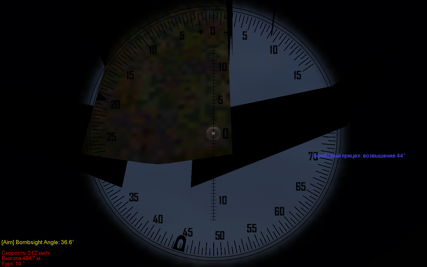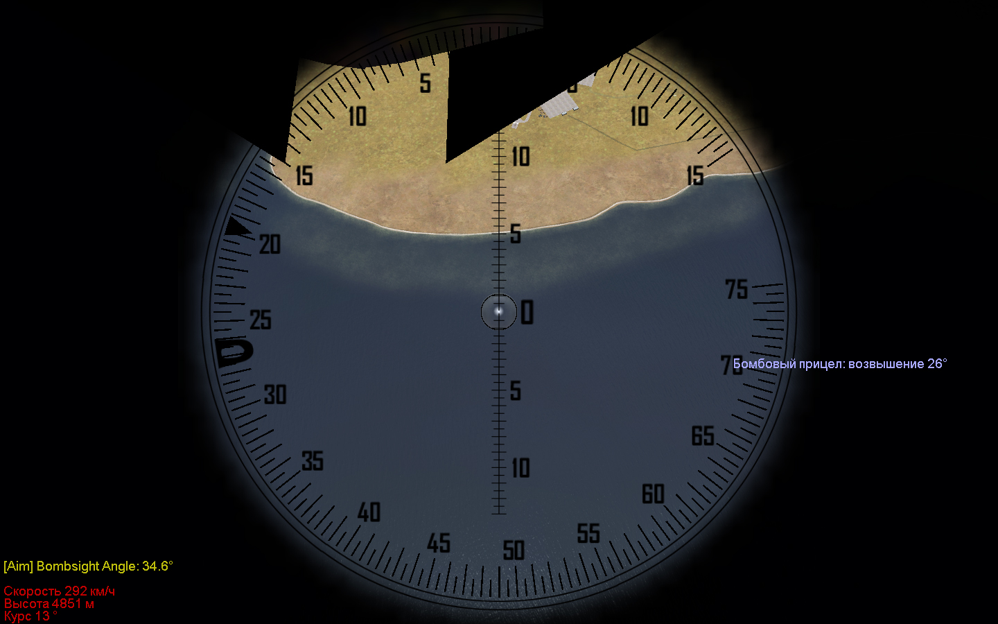 Кривоват простите в чём? У меня при полёте на Ланкастере, вот что видать в бомб.прицеле. И чем выше поднимаешь тем хуже. Как наводится на цель? Или такая беда только у меня?