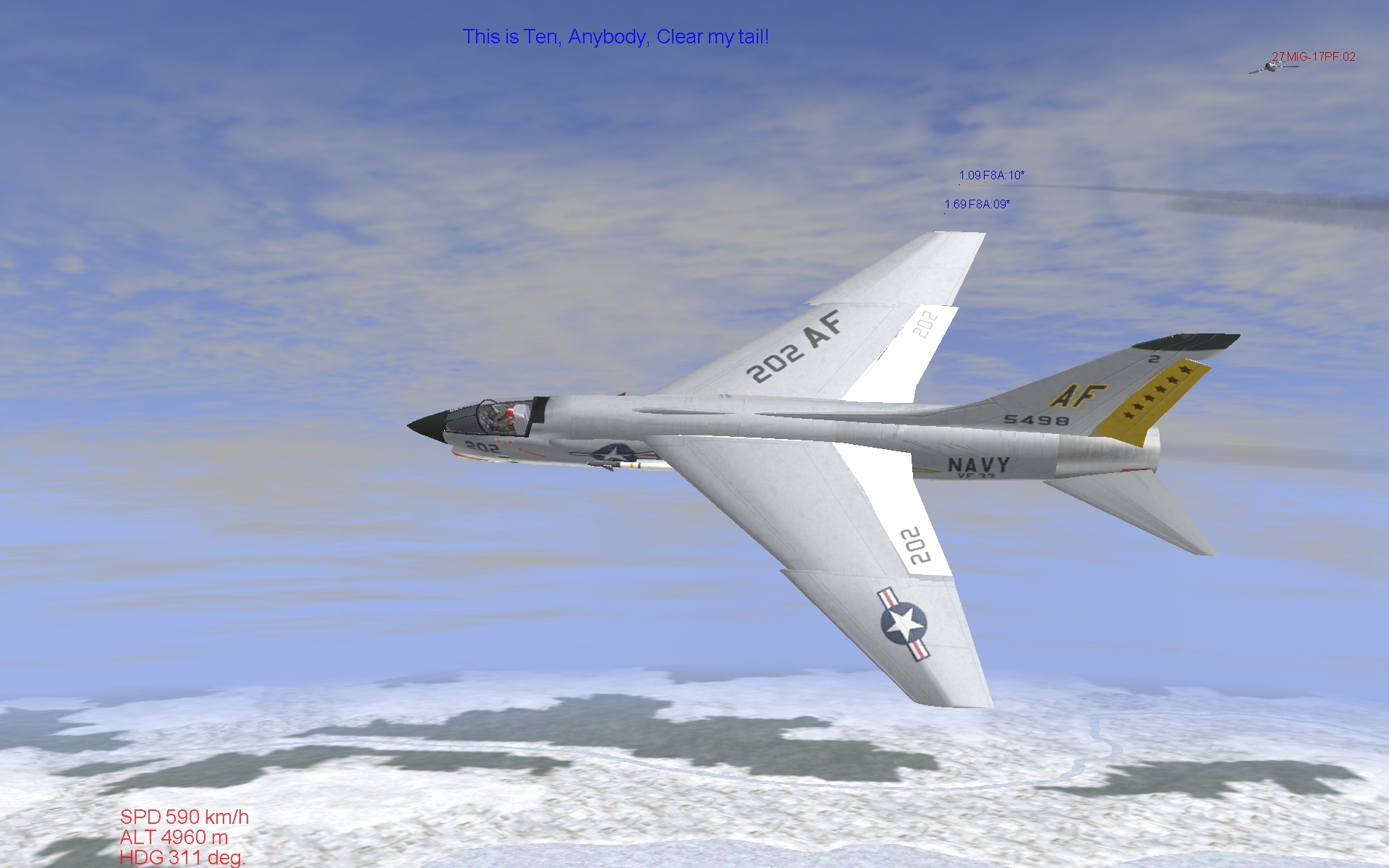 Как варианты: 1).ДиффМ именно для УП у тебя установлен? 2). Не совсем понял ридмик к F8 , но : F-8A Crusader PRE-BETA This release is for skinning purposes. It is basicaly the TF-9J with an F-8A Model. - Only Aim-9 Hooks are in here, no other weapons - It still has the TF9J Flight model - Al Animations are in the wrong place - No Gear какая то связь с TF9J.. У меня он был установлен ранее. 3).( Из собственных наблюдений) Не слишком ли много у тебя в УП установлено других модных самолётов( помимо уже входящих в УП)? Ну вот, пока и достаточно. Дерзай! ![]()