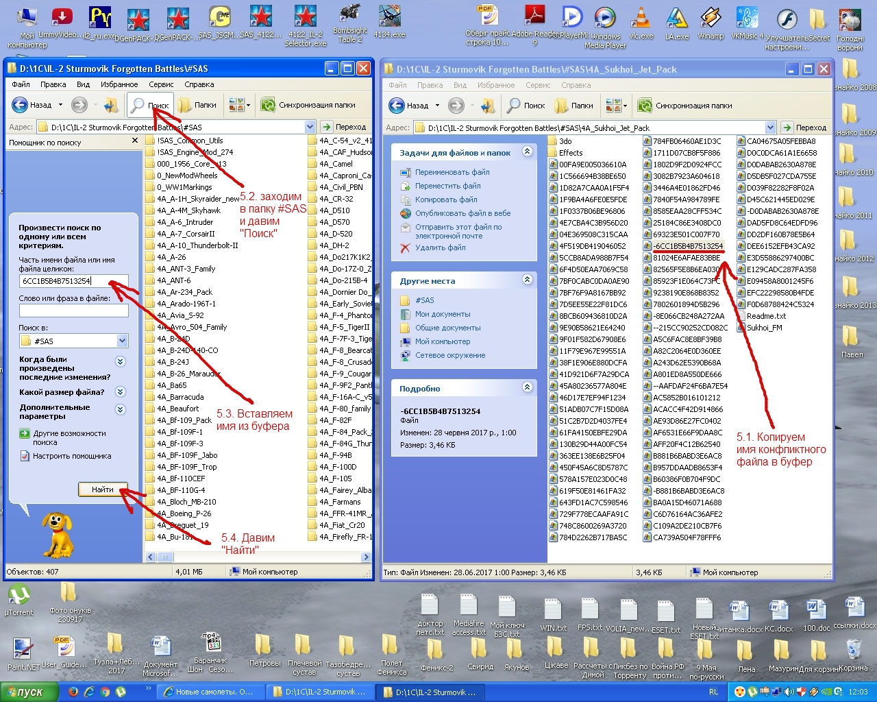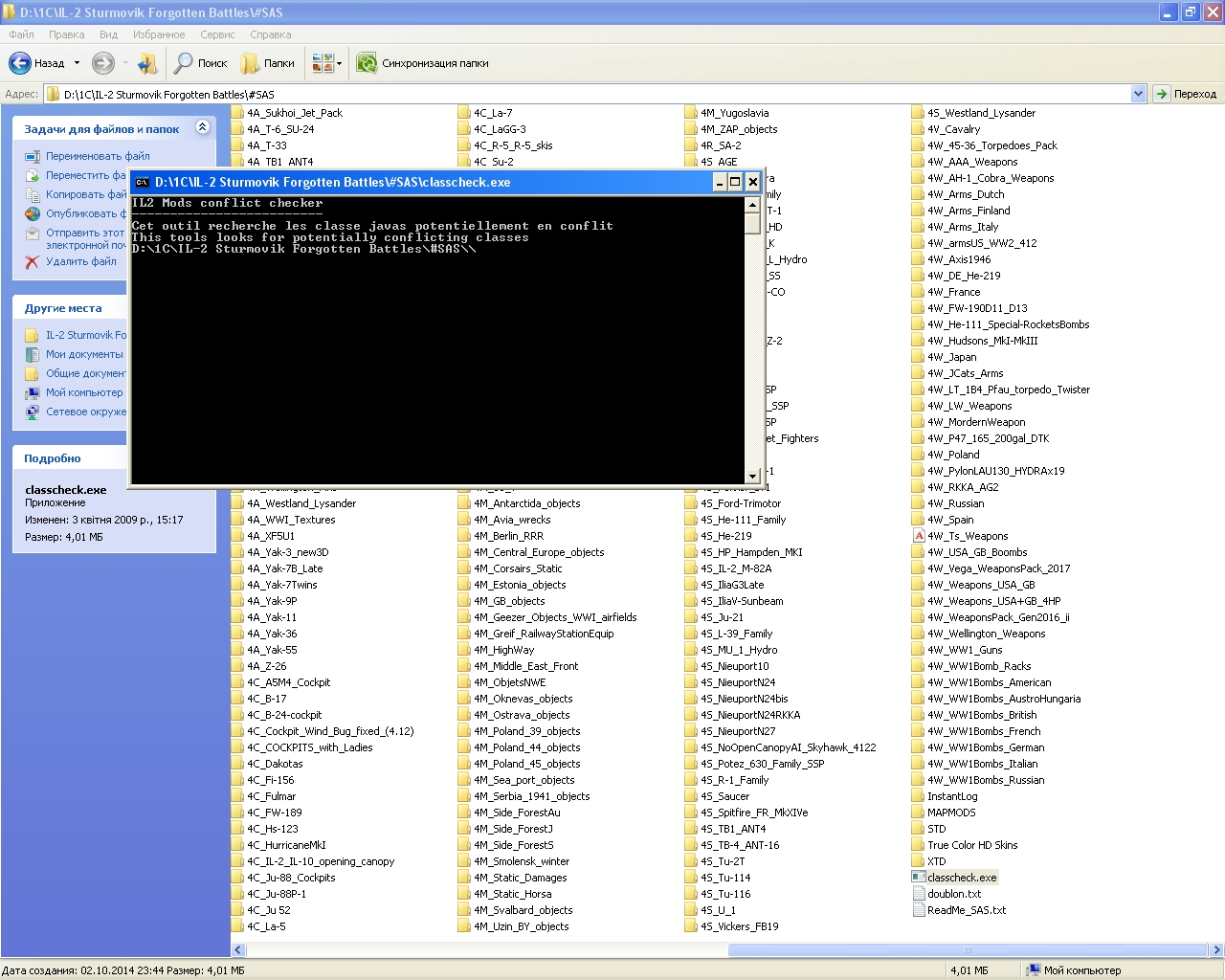 Шаг 1. В архиве с classchecker'ом всего два файла - classcheck.exe и doublon.txt - оба нужно поместить в папку ...IL-2 Sturmovik Forgotten Battles\#SAS и запустить classcheck.exe Шаг 2. После запуска classcheck.exe на экране появится черное окошко, которое может висеть от нескольких секунд до нескольких минут (чем больше в папке МОДов и чем дольше их не проверяли, тем дольше будет висеть окошко). Спокойно подождать (возможно, даже успеете выпить чашечку кофе )Шаг 3. Когда черное окошко погаснет, открыть файл doublon.txt Шаг 4. Просмотреть его содержание. В норме должно быть так, как на картинке, т.е., список потенциально конфликтных и дублирующих классов должен быть пуст. "Потенциально конфликтные" классы - это классы с одинаковыми именами, но разным содержимым (я их называю "однофамильцами"). Они могут конфликтовать друг с другом, вызывая разные неприятные глюки. Во избежание этого необходимо "заминусовать" (т.е., переименовать, добавив в начало имени минус) всех "однофамильцев", кроме одного. Я обычно минусую классы в новом МОДе - тогда меньше риск, что не заглючат уже существующие МОДы. Но иногда (если результат нас не удовлетворяет) приходится делать наоборот, т.е., старых "однофамильцев" минусовать, а новых оставлять без переименования. Но это скорее исключение, чем правило. А есть еще классы-"близнецы" - с одинаковым именем и содержимым. Они не опасны, просто захламляют пространство на диске. Я их тоже минусую, только двумя минусами, чтобы самому понимать, какой класс был конфликтным, а какой просто "близнецом". Почему надо минусовать, а не удалять? На тот случай, если захотите запустить этот МОД на другом компьютере/в другой сборке или с кем-то поделиться - тогда надо разминусовать все классы и повторить проверку classchecker'ом: список "однофамильцев" и "близнецов" может оказаться совсем другим. Шаг 5. Зная список конфликтующих и/или дублирующихся классов, в параллельном окне открываем папку #SAS и "Поиском" ищем - в первую очередь "однофамильцев", а затем "близнецов". Шаг 6. По итогам поиска выполяем процесс минусовки (пошагово показан на картинке на примере моего пака "Сухих" на аналогичной сборке) Далее - запускаем игру и проверяем, что в итоге получилось. Вообще, такую операцию надо проводить сразу после установки каждого нового МОДа. Удачи! Дайте знать о результатах. P.S. Во вложенном архиве ReadMe_SAS.rar - моя система переименования папок с МОДами, лежащих в папке #SAS - они видны на картинках. Лично мне помогает не запутаться в многочесленных папках и быстро найте - где самолеты, где корабли и т.д.