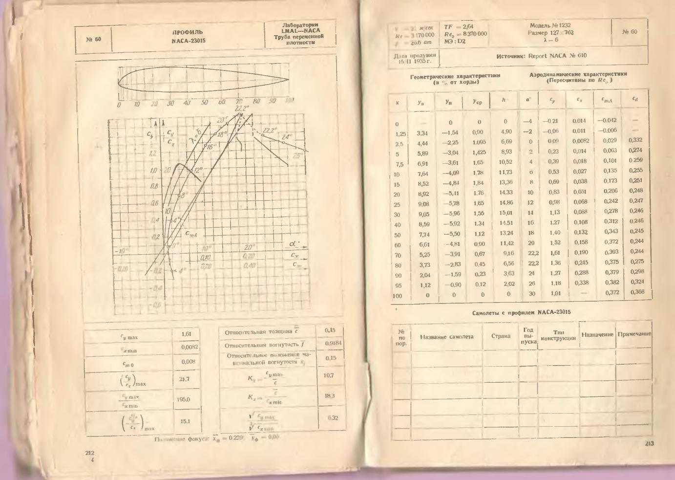 [Params] CriticalAOA 21.00 CriticalCy 01.42 CxCurvature 00.76 CxStraightness 00.115 CriticalAOAFlap 17.00 CriticalCyFlap 01.54 SpinTailAlpha 17.00 [Polares] lineCyCoeff 0.08789113 // дефолт AOAMinCx_Shift 0.517 // если Сма 0.17 на 8* Cy0_0 0.16 AOACritH_0 19.0 AOACritL_0 -16.0 CyCritH_0 1.3306869 // дефолт CyCritL_0 -0.82 // дефолт ФВ-190 из патча 4.09 CxMin_0 0.0513 parabCxCoeff_0 4.5E-4 // дефолт ФВ-190 из патча 4.09 - 4.3 Cy0_1 0.61451983 // дефолт AOACritH_1 17.0 AOACritL_1 -22.0 CyCritH_1 1.54 // расчётное - из параболы на графике Кравца CyCritL_1 -0.74 // дефолт ФВ-190 из патча 4.09 CxMin_1 0.1113 // из параболы на графике Кравца 0.06+CxMin_0 0.0513 parabCxCoeff_1 6.0E-4 // дефолт ФВ-190 из патча 4.09 - 5.7 parabAngle 5.0 // парабола для Cy0_0 0.16 Decline 0.010 // предполагаю это обдувка винтом maxDistAng 38.0 // дефолт ФВ-190 из патча 4.09 draw_graphs 0 из атласа Кравца вообще 22 градуса.,установка крыла на глаз около 1 градуса., крыло не очень чистое из-за полуоткрытых ниш шасси и всяких крючёчьков/пилонов, поэтому Су макс не очень высокое, у Фоки по немецким отчётам до 1.5. Су макс на посадке для модели Т немного увеличил - там на 20 град. опускаются элероны. Су макс на графиках профиля НАСА 23015/012 1.61/1.63 - картинки ниже. Взял Су макс среднее - 1.62х0.875=~1.42 -вписал в параметры., на 20*(минус 1* - 19*) Су макс - 1.52х0.875=1.33. Всё "сходится" с графиками из атласа и дефолтом. ![]() Такие мысли. ![]()