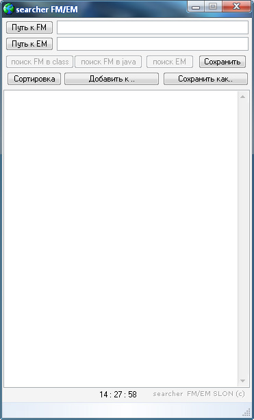Автор(ы) мода: SLON. Категория мода: программа. Ссылка на скачивание: http://narod.ru/disk/4227216001/searcher.rar.html ftp://195.177.105.58/MODs/4.09/SOFTware/searcher.rar Или в аттаче. Ссылка на обсуждение: http://dispersalfield.ru/main/index....pic,129.0.html. Краткое описание что мод делает: 1. Ищет ФМ строки в классах и помещает в список по формату. 2. Ищет EM в распакованном файле и добавляет к списку по формату Краткая инструкция по установке: . Размер архива: 47 КБ.