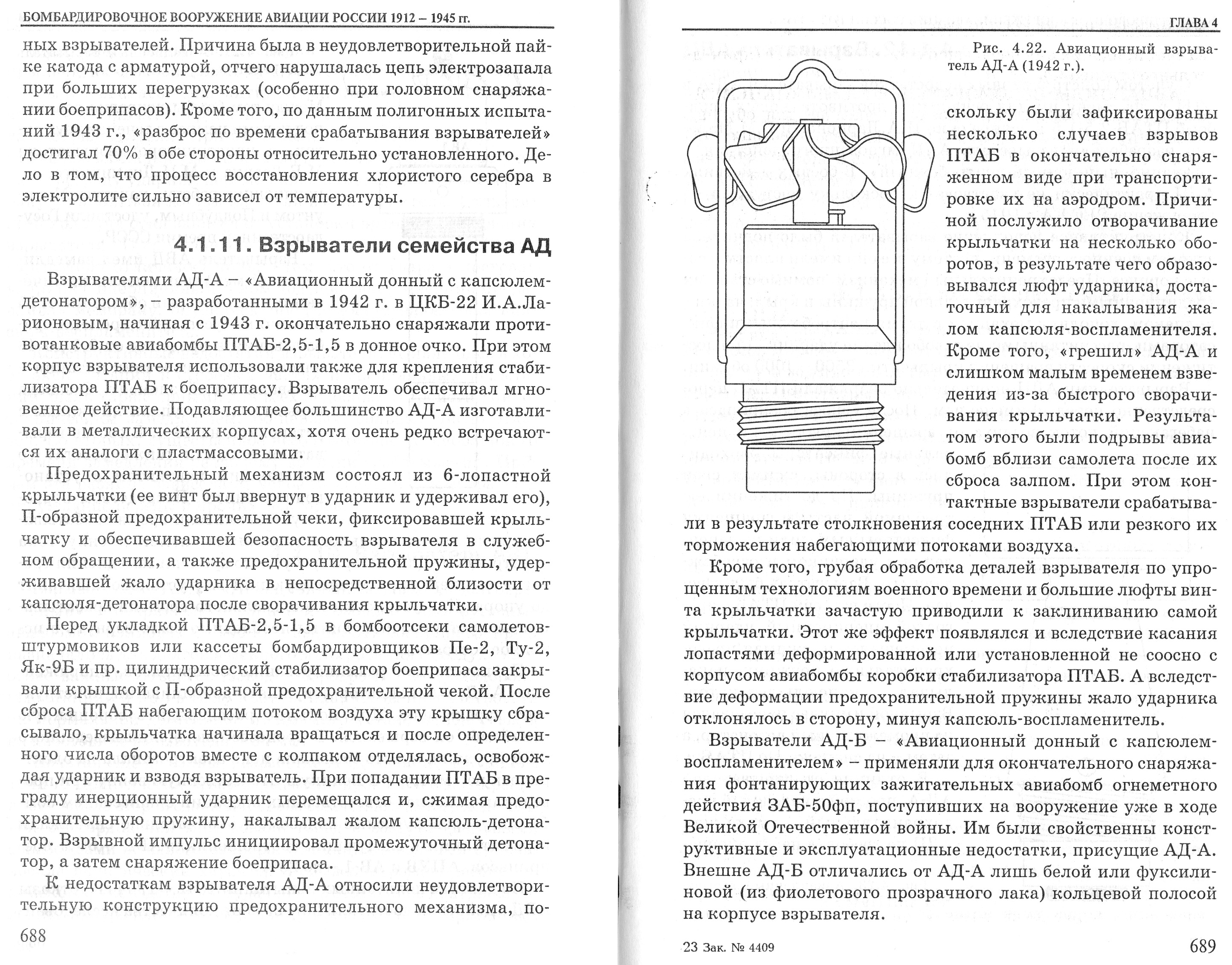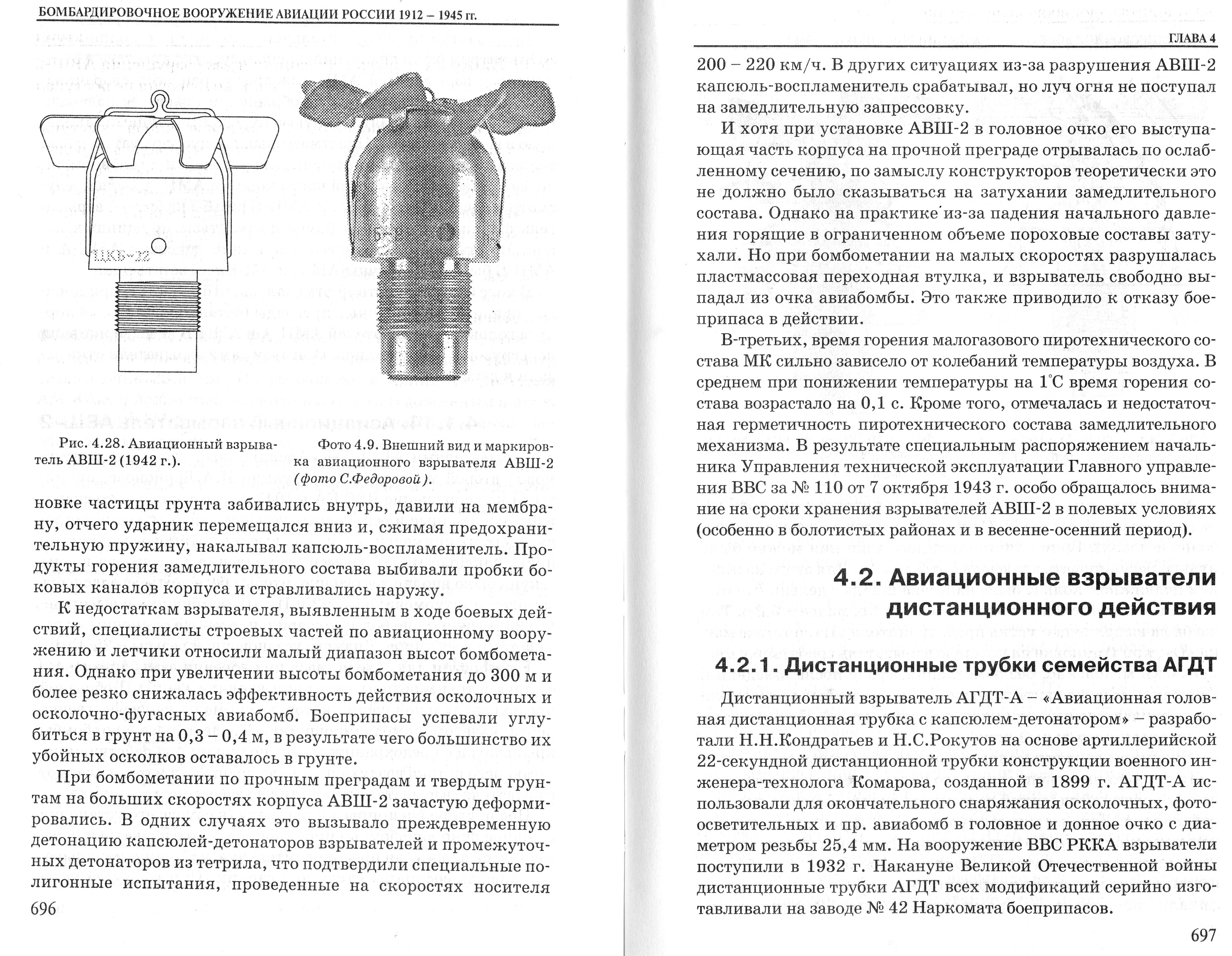 по отечественным взрывателя я на Сухом уже озвучивал инфу...: "1. АДЗ " Авиационный донный с замедлением". Минимальная высота применения 200-600м в зависимости от калибра бомбы, задержка 0.15-0.3 сек. Использовался для осколочных и фугасных бомб. 2. АДЗУ " Авиационный донный с замедлением упрощённый". Минимальная высота применения 200-600м в зависимости от калибра бомбы, задержка 0.15-0.3 сек. 3. АГМ-1к/д (АГМ-1А) "Авиационный головной мгновенный первой модели с капсюлем-детонатором" (в головное очко осколочных, осколочно-химических и практических бомб). Минимальная высота применения 100-400м При бомбометании с высот менее 100м взрыватель часто отказывал в действии, поскольку крылчатка не успевала отделиться. При бомбометании с высот более 100м число отказов не более 4%. 4. АГМ-3 "Авиационный головной мгновенный третьей модели" применялся для снаряжения осколочных и осколочно-фугасных бомб. Минимальная высота применения 300-600м. 5. АГЗ "Авиационный головной с замедлением"...замедление 0.15-0.3 сек. Минимальная высота применения - 600м. 6. АДП "Авиационный донный с переменным замедлением". Только для фугасных бомб калибром от 16кг и выше ( за исключением 50кг). Снаряженные им боеприпасы применялись для штурмового бомбометания ( с предельно малых высот). Имел фиксированное замедление 0.15-0.3 сек. и переменное замедление 0.3-22сек. 7. АГП "Авиационный головной с переменным замедлением". Использовался для снаряжения в головное очко фугасных бомб калибром от 50кг и выше. Имел фиксированное замедление 0.15-0.3 сек. и переменное замедление 0.3-22сек. 8. АВ-4 "Авиационный взрыватель четвёртой модели". Для снаряжения в головное очко осколочных бомб и бомб вспомогательного назначения. Минимальная высота сброса - 100м по земной и 600м о водной поверхности. Мгновенное действие или замедление 0.1 сек. 9. АПУВ "Авиационный пневматический универсальный взрыватель". Для снаряжения в головное и донное очко фугасных и бронебойных бомб. Минимальная высота сброса 200-1500м по земной и 600-1500 по водной поверхности. Мгновенное действие или замедление 0.15-0.3 сек. 10. АВ-1 "Авиационный взрыватель первой модели". Для снаряжения в головное очко фугасных бомб при необходимости бомбометания с малых и предельно малых (штурмовых) высот ( в диапазоне 15-600м). Время замедления 22сек. 11. АВ-87 "Авиационный взрыватель восемьдесят седьмой модели". Для снаряжения фугасных, бронебойных и противолодочных бомб всех калибров. Минимальная высота сброса по земной поверхности - 300м. Имел плавно изменяемое ( с шагом 0.2сек) замедление от 0 до 7.4 сек. 12. АД "Авиационный донный с капсюлем-детонатором". Для снаряжения ПТАБ-2.5-1.5 в донное очко. 13. АМ-А "Авиационный мгновенный с капсюлем-детонатором". Для снаряжения исключительно в головное очко осколочных, практических и авиабомб вспомогательного назначения. Минимальная высота применения - 100м по земной и водной поверхности. 14. АВШ-2 "Авиационный взрыватель штурмовой второй модели". Для снаряжения в головное очко осколочных и осколочно-фугасных бомб при штурмовых ударах с предельно малых высот. Задержка взрывателя фиксированная - 7сек. 15. АГДТ "Авиационная дистанционная трубка с капсюлем-детонатором". Для снаряжения осколочных, фотоосветительных и прочих авиабомбв головное и донное очко. Земедление от 5 до 22 сек. с шагом 0.2-1 сек. или мгновенное срабатывание. 16. ТМ4-А "Трубка механическая четвёртой модели с капс