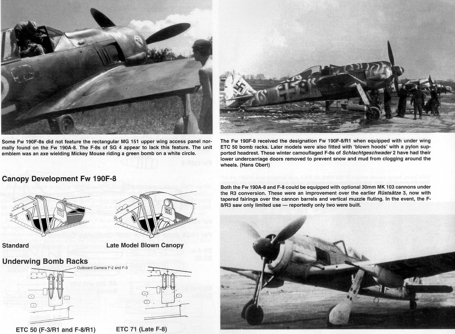 за вариант штурмбока говорит еще то, что на почти всех фотографиях ф-8х как то не видно дополнительных бронестекол и плит около кабины... кстати, в связи с этим всем есть две мелочи, вернее мелочь и не мелочь - первое это то что иногда пишут о том, что якобы фонарь с улучшенным обзором, а иногда даже и 13мм пулеметы, ставились и на штурмовиках с основой в виде а-5-6... с пулеметами могут путать, а про фонари звучит правдоподобно... во всяком случае, в "фв190 ин экшн" пишут что фонари с улучшенным обзором, как и на истребителях, появились на поздних штурмовиках ф-8... отсюда какбы смысл, раз уж важны мелочи типа отклонения щитков и панелей на крыльях, реализовать и такие различия... второе - это наличие мк-108 у истребителей и штурмовиков на обоих фронтах... или тут все ясно? |