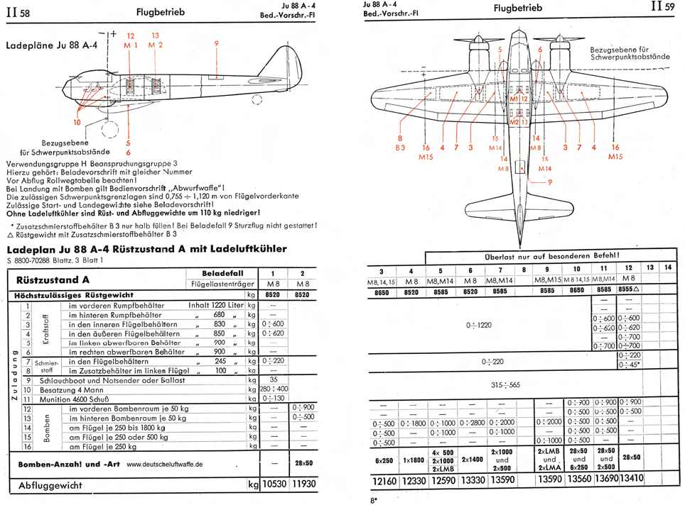 Вот тут есть все загрузки А-4, в том числе упоминание про консольные 250 кг: L.Dv.T.2088A-4/Fl Ju 88A-4 Bedienungsvorschrift-Fl Bedienung und Wartung des Fluzeuges Juli 1941 Teil II Flugbetrieb 58-63 При чем 6х 250 кг есть в 3-х вариантах: с топливом на дальность 1260 км, 2340 и 2900 км соответственно со взлетным весом 12160, 13080 и 13730 кг. Например вот: Последний раз редактировалось Karabas-Barabas; 18.09.2010 в 00:30. |