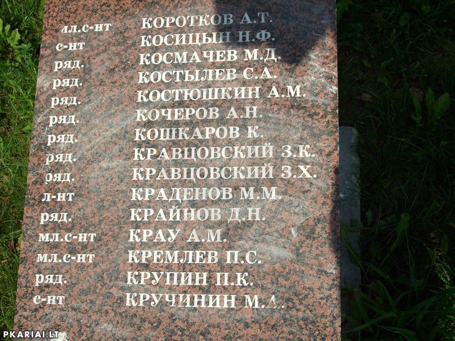 Воинское кладбище города Пренай (Литва), на котором я принимал присягу, и где похоронен командир звена 1 АЭ 15 ИАП Краденов Михаил Михайлович, сбитый на взлёте с аэродрома Пацунай (около 10 км от г. Пренай) штабным звеном III./JG53 в промежутке с 17:43 до 17:48, 22 июня 1941 года.