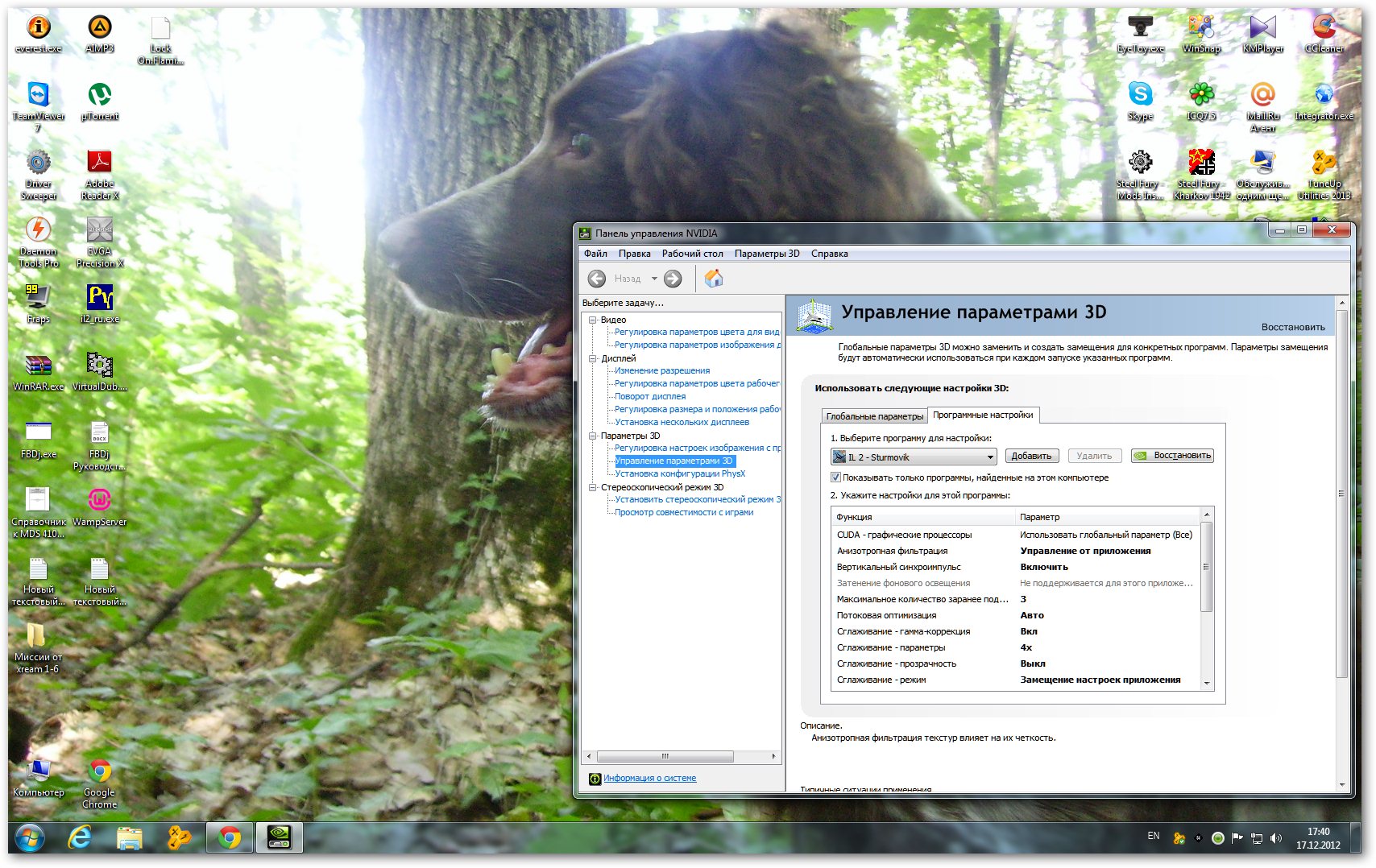 Давно пора уже прочесть эту ветку http://www.sukhoi.ru/forum/showthread.php?t=43603 Настроить в панели, и пользоваться прогой iL-2 Config v.2.55A.exe коль железо не старое замените у себя в конфс ини эту секцию, [Render_OpenGL] DiffuseLight=2 DynamicalLights=1 Effects=1 ForceShaders1x=0 Forest=2 HardwareShaders=1 LandDetails=2 LandGeom=2 LandShading=3 MeshDetail=2 PolygonOffsetFactor=-0.15 PolygonOffsetUnits=-3.0 Shadows=1 Sky=2 Specular=3 SpecularLight=2 TexCompress=0 TexFlags.ARBMultitextureExt=1 TexFlags.ClipHintExt=1 TexFlags.DepthClampNV=1 TexFlags.DisableAPIExtensions=0 TexFlags.DrawLandByTriangles=0 TexFlags.PolygonStipple=0 TexFlags.SecondaryColorExt=1 TexFlags.SeparateSpecular=1 TexFlags.TexAnisotropicExt=1 TexFlags.TexCompressARBExt=0 TexFlags.TexEnvCombine4NV=1 TexFlags.TexEnvCombineDot3=1 TexFlags.TexEnvCombineExt=1 TexFlags.TextureShaderNV=1 TexFlags.UseAlpha=0 TexFlags.UseClampedSprites=1 TexFlags.UseDither=0 TexFlags.UseIndex=0 TexFlags.UsePaletteExt=0 TexFlags.UseVertexArrays=0 TexFlags.VertexArrayExt=0 TexLandLarge=1 TexLandQual=3 TexLarge=1 TexMipFilter=3 TexQual=3 VisibilityDistance=3 Water=2 VideoSetupId=17 Разницу увидите сразу, и в панели н види поставьте параметры как на скринах |