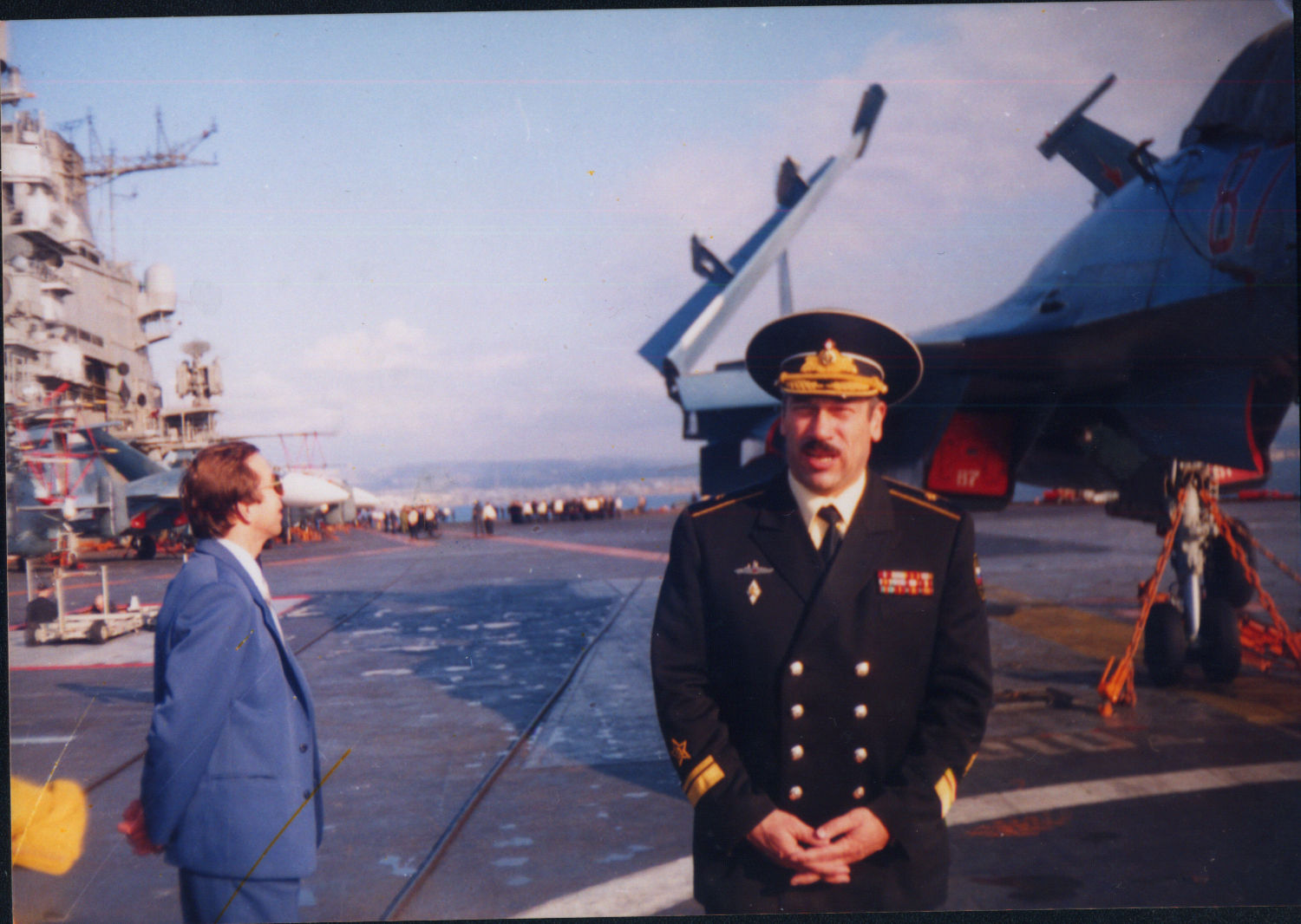 Вот еще одно событие, которое произошло во время моего пребывания в Сирии. В декабре 1995 года вышел в свой первый дальний поход единственный российский авианосный крейсер «Адмирал Кузнецов» с самолетами на борту. Этот поход был приурочен к 300 летию российского ВМФ. Конечной точкой маршрута был остров Мальта в Средиземном море. В процессе этого похода были и промежуточные точки остановки. Одной из таких точек был сирийский порт Тартус (это второй по величине порт Сирии, первый – это порт Латакия). В Тартусе в то время находилась российская военно-морская база – вот в нее то и зашла группа кораблей в составе авианосца «Адмирал Кузнецов» и эскадренного миноносца «Бесстрашный» в конце января 1996 года. При этом авианосец (огромный корабль) остался на рейде порта, а эсминец подошел к причалу. Ну а мы, российские преподаватели сирийской военной академии, получили приглашение посетить с экскурсией эти корабли. К огромному сожалению, я накануне этого события приболел и лежал с температурой, поэтому мы с женой не поехали (о чем потом, посмотрев фото и в/материалы, я очень жалел), но наша младшая дочь поехала с моими коллегами и их семьями (был организован автобус из Алеппо в Тартус) и привезла фото и видеокассеты (именно кассеты, дисков DVD тогда еще не было, а вот в/камера аналоговая, кассетная у меня тогда была). Наши на автобусе приехали в порт Тартус прямо к причалу и их на катере доставили на авианосец. Командовал этой группой кораблей адмирал Игорь Касатонов (бывший Командующий Черноморским флотом, в то время – первый заместитель Главнокомандующего ВМФ РФ) – он вместе с летчиками и флотскими командирами уехал на фуршет в Дамаск на прием к Главкому ВМФ Сирии. (у меня есть в/кассета этого фуршета, так же как и кассета полетов наших летчиков над Средиземным морем), на хозяйстве остался контр-адмирал (фамилию его я не знаю) – это он на фото, он встречал моих коллег- преподавателей с семьями на палубе авианосца и провел экскурсию по кораблю (на в/кассете все это озвучено, он очень подробно рассказал о корабле и его истории, затем к экскурсии подключились и другие члены экипажа корабля). После экскурсии на авианосце наших на катере отвезли на эсминец – там то же была подробная экскурсия по кораблю, затем были накрыты два стола – для взрослых (сами понимаете с чем) и для детей (с соками и мороженым), кроме того на эсминце играл флотский духовой оркестр, исполнялись российские военные марши – все это на кассете есть. Но я еще прикладываю две очень интересные статьи, посвященные этому походу, адмирала в отставке Валентина Селиванова – в то время начальника Главного штаба ВМФ РФ - он на Мальте заменил И.Касатонова и привел корабли домой в Североморск.