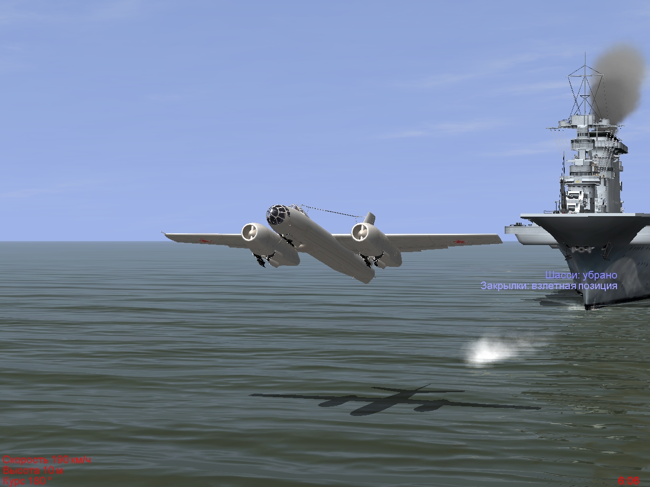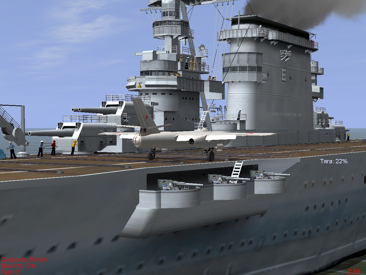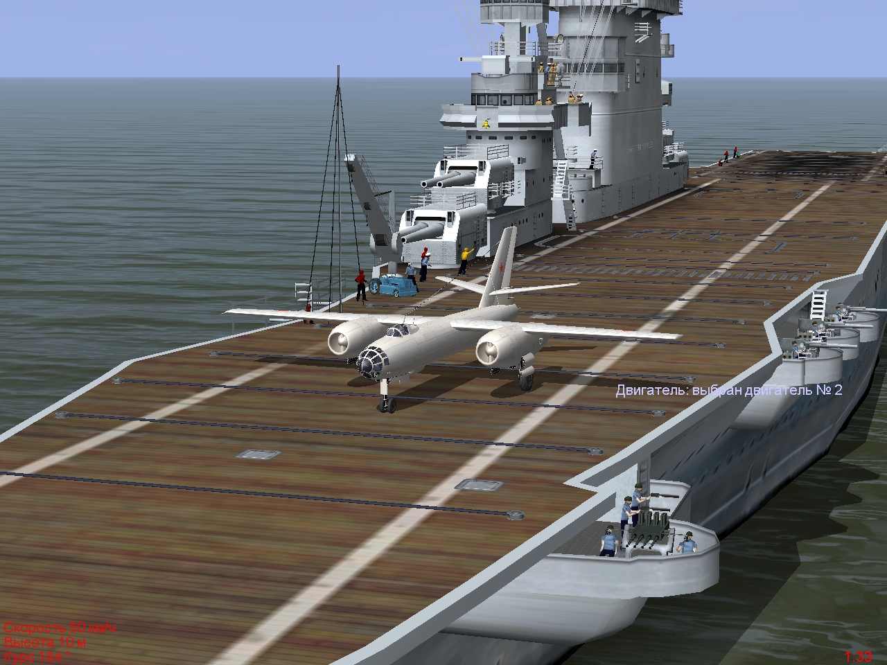 В прицепе два нередактированных трека ntrk. При скорости авианосца 30 км/ч длины палубы хватает только для пробега Ме-262. А при скорости авианосца 60 км/ч удается посадить Ме-262 и взлететь на нем же без разворота. Т.е., длины палубы хватает и на пробег, и на разбег. На палубе перед взлетом вышла небольшая заминка: перестали отображаться обороты правого двигателя, пришлось перезапустить его на всякий случай. Цитата: