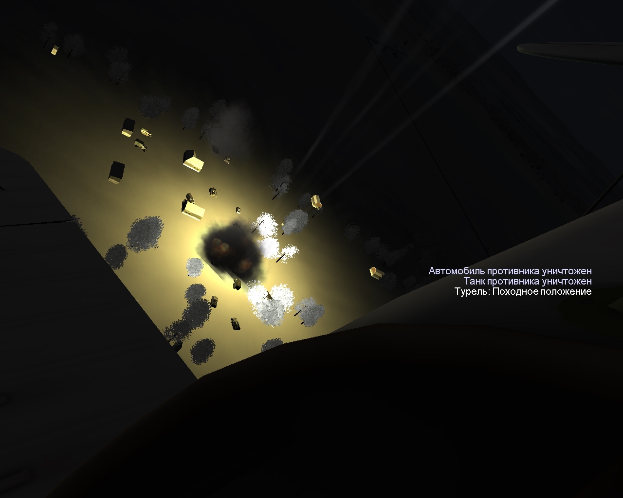 Третья миссия мне понравилась. Цели демаскировали себя стрельбой по подошедшим ранее товарищам. С прицелом решил не заморачиваться, вспомнил всё, что читал про "ночных ведьм", убрал газ в ноль и сбросил бомбы "под капот" с пологого пикирования. И двумя попал! Танк, ЗСУ и автомобиль накрыл. Взрыватели использовал низковысотные. P.S. Давно обещанные "скрины".