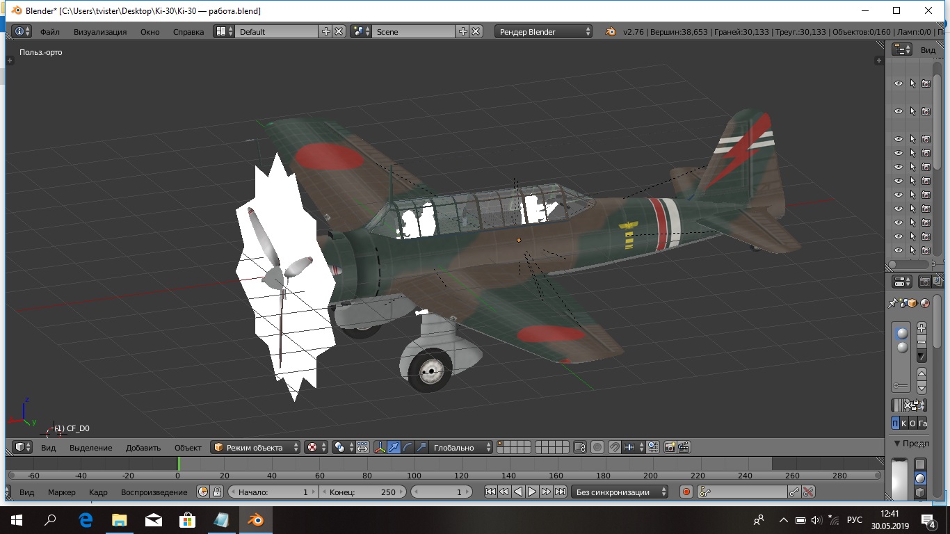 При разборе исходной модели, обратил внимание на неправильное расположение центральных точек частей модели. Части крыла, стабилизатор, киль, центральная точка этих частей находится по задней кромке крыла в фюзеляже. В моей модельке всё расставлю по образцу и подобию дефолтного Д3А-Вел. И главная неприятность, нет компоновочной схемы Ки-30. Мне не известно количество и расположение бензо/масло баков, где находятся маслорадиатор и воздухозаборник карбюратора, как расположены лонжероны и проводка управления, в общем не известно ничего... Придется все делать по образцу Ки-51. |