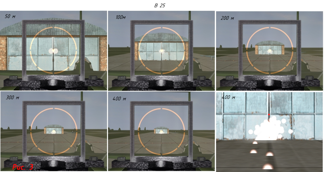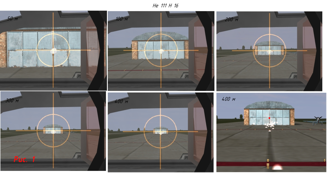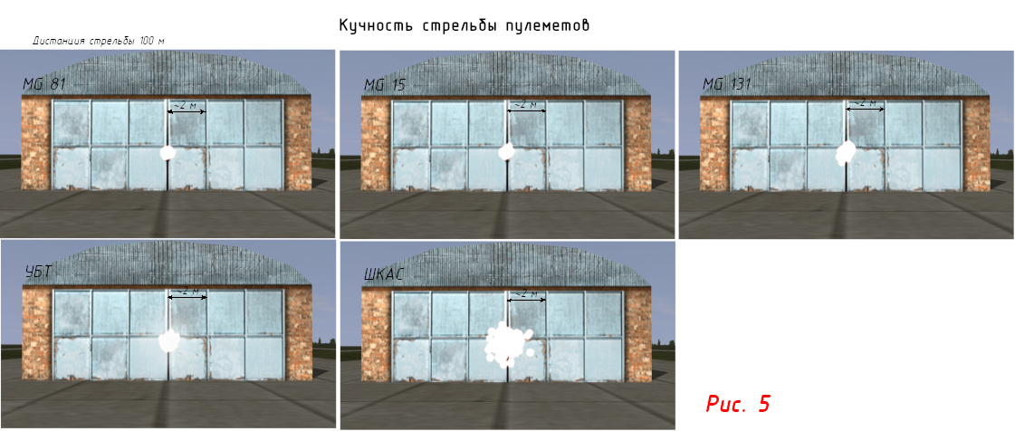 При стрельбе на 50-100 м СТП может получиться очень близко к точке прицеливания. Можно предположить что пристрелка есть на это расстояние. Однако, учитывая что истребители открывают огонь с гораздо большего расстояния и борт стрелок открывает огонь также гораздо дальше, то пристреливать оружие на минимальные 50-100 м никто никогда не станет. Поэтому эту настройку можно считать забагованной. Есть баг с прицеливанием борт стрелков на некоторых пулеметах. При стрельбе глаз борт стрелка и элементы прицела: визирный штырь и перекрестье прицельной сетки должны быть на одной линии (самолет стоит на земле, никакой тряски нет). Типа целик и мушка на автомате. Однако это не всегда так в игре. Подробнее об этом и о других найденных багах ниже. Ju 88A5 подн. задн. нижн. пулемет, He111H2, H6 задн. верх. пулемет, He111 H6, H11, H12, H16 передняя пушка-задний визирный штырь прицела видится немного ниже перекрестья передней прицельной сетки. He111H2, H6 задний нижн. пулемет, He111H6, H11 передний нижний пулемет-задн. визирный штырь прицела видится ниже и немного левее перекрестья передней прицельной сетки. He111H2 передний пулемет, He111 H2, H6, H11 правый и левый бортовые пулеметы-задний визирный штырь прицела видится выше и немного левее перекрестья передней прицельной сетки. He111 H2 передний пулемет-пристрелка в районе 1000 м. Это слишком много. При стрельбе по истребителю на дистанции 50-1000 м при такой настройке пули попусту перелетают через цель, не нанося никакого вреда (точка прицеливания-кок винта цели). Bf 110 C4, C4/B, D-1, E-2, F-2 задн. пулемет-задн. визирный штырь прицела видится ниже перекрестья передней прицельной сетки. Ki 45 задн. пул.-задн. визирный штырь прицела видится немного правее и выше перекрестья прицельной сетки. B25 прав. боковой пулемет-пули вылетают сильно левее линии прицеливания. Лев. боков. пулемет-пули вылетают сильно правее линии прицеливания. B25 передний пулемет, B24 передние правый и левый пулеметы-пристрелка больше 1200 м, стрелять с такого расстояния толку нет, очевидный баг. SM 79 боковой прав. пулемет-пули проходят немного левее линии прицеливания. Боковой левый пулемет- пули проходят левее линии прицеливания. Криво установлен задн. визирный штырь прицела (смещен вправо от оси канала ствола). ТБ3 все пулеметы-траектория полета пуль уходит сильно вправо от линии прицеливания при стрельбе когда разворачиваешь пулемет направо. Отклонение пулемета под прямым углом к продольной оси самолета дает максимальн. отклонение траектории. При стрельбе налево то же самое, только в левую сторону. ТБ3 4М-34Р, ТБ3 "Звено-СПБ" задний пулемет-дополнительно к вышеописанному про ТБ3 при отклонении пулемета вправо или влево траектория полета пуль уходит сильно вниз от линии прицеливания. Хотелось бы еще обратить внимание на кучность пулемета ШКАС. На рис.5 показана кучность стрельбы с разных пулеметов. У ШКАСа она значительно ниже всех остальных стволов. В качестве мишени использован ангар, одна секция на воротах у него равна примерно 2 м в ширину, считаем это по разметочной сетке в полном редакторе. Отталкиваясь от этого примерно прикидываем радиусы разлета пуль пулеметов. По примерным подсчетам радиус рассеивания 100 % пуль у ШКАСа на дистанции 100 м идет где то в районе 1 метра. Это в разы больше чем у всех остальных пулеметов. В любом случае нужно смотреть в код игры. Для сравнения у MG 81 кучность стрельбы 