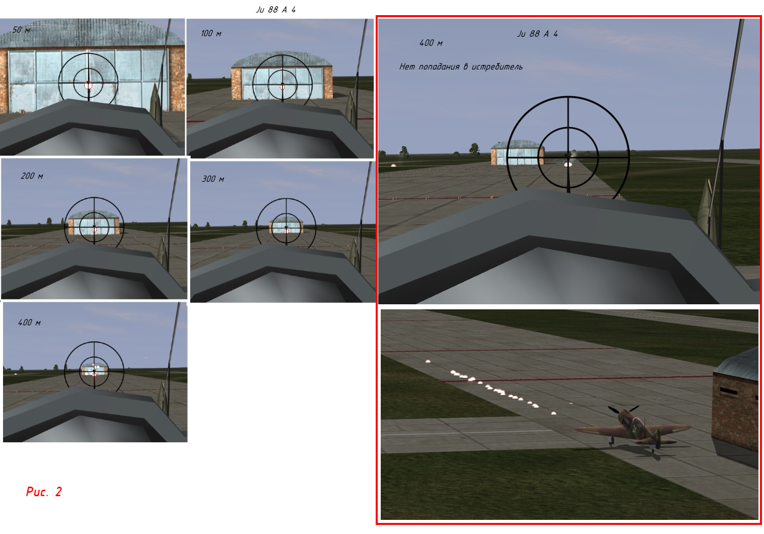 Не знаю в каком патче возникли эти баги, я их заметил в этом, поэтому пишу сюда. У оборонительных пулеметов бомбардировщиков нет нужной пристрелки. Бомбардировщик, находясь под атакой истребителя, оказывается в заведомо проигрышной ситуации, потому как его пулеметы стреляют неизвестно куда. Необходимо ввести настройку "Дистанция пристрелки подвижных пулеметов" или пристрелять пулеметы на фиксированную дистанцию 400 м. На рис. 1-4 ниже показаны стрельбы с некоторых огневых точек некоторых бобров на дистанциях 50, 100, 200, 300 и 400 метров, сделанных на импровизированном полигоне. На рис. 2 показана стрельба с Ju 88 по истребителю с дистанции 400 м. Попадания в цель отсутствуют, пули уходят ниже. И такая ситуация практически на всех пулеметах бомбардировщиков. Исключение составляют некоторые пулеметы, имеющие пристрелку ~ 300 м: He111H6, H11 нижний передний пулемет, SM 79 задний верх. пулемет , боков. прав. пулемет. И несколько других пулем., о них ниже.