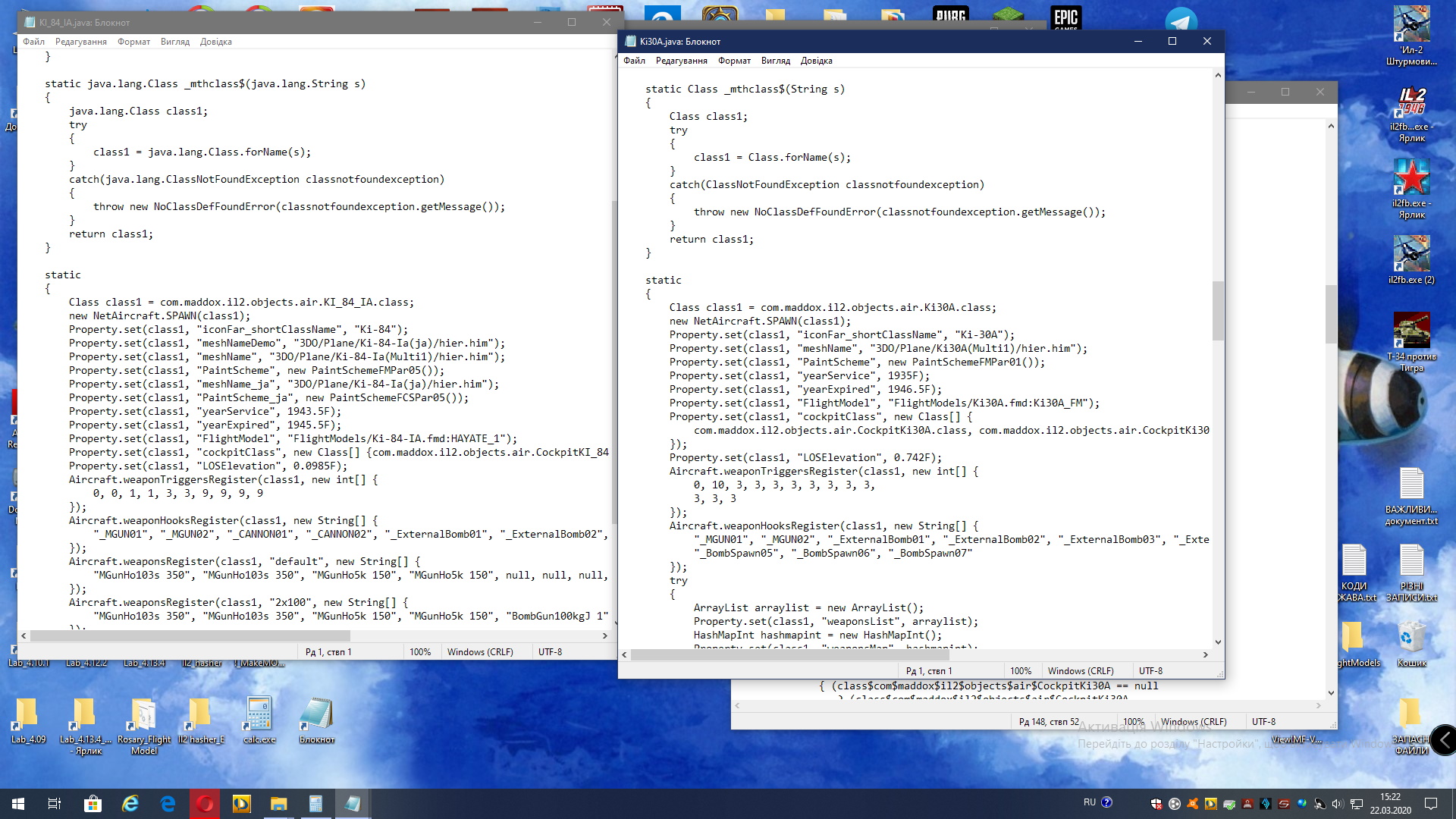 Load static objects sFMDir = ki30a_fm s1 = flightmodels/nakajima_das_japan.emd s = FlightModels/Nakajima_DAS_JAPAN:Ki30A_FM.emd m_lastFMFile = gui/game/buttons Mission error, ID_04: java.lang.NullPointerException ![]() Я ж был исправил класс Ки-30 что бы Ил не сходил с ума. Там опять поселился вар_класс и всё перемешалось. ![]() Стараюсь ориентироваться на классы из дефолта - там всё чётко видно и не нужно выискивать в нагромождениях кода нужную букву. ![]() Я не знаю под какой патч сборка, поэтому не могу сказать какой диффим ставить. ![]() У меня под каждый патч есть свой диффим/флайт-модельз-мейн. ![]() ------------------------------