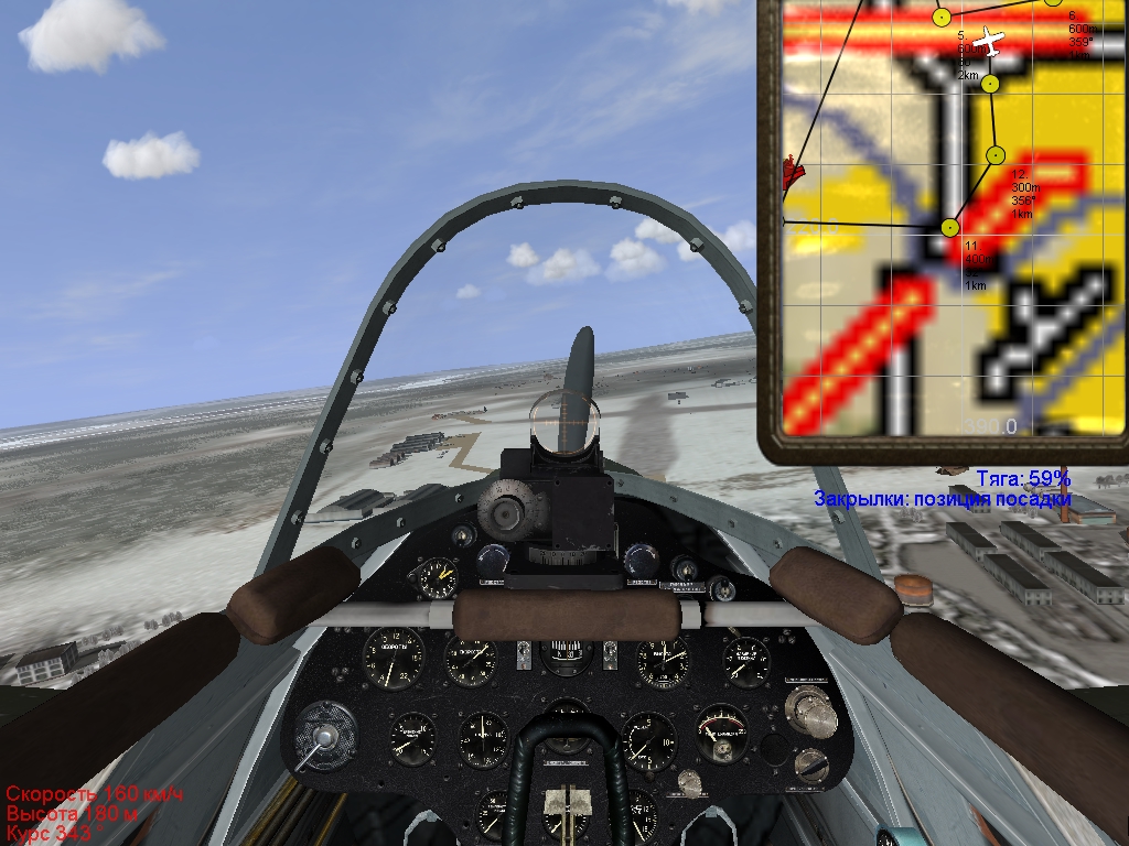 15 декабря 1938 года, Город Москва. Центральный аэродром им. М.Фрунзе (Ходынка). Время: 13 час 00 мин. Метео условия: простые, легкие кучевые облака с нижним краем 2500 м. Резко похолодало - температура наружного воздуха минус 25 градусов. Скин самолета: I-180 red guard. bmp На сегодня, после срочного устранения всех неисправностей, влияющих на безопасность полетов, запланирован первый контрольный полет опытного новейшего истребителя И-180 конструктора Н.Поликарпова. Но, пока, на самолет не удалось установить безотказную систему привода заслонок-жалюзи, регулирующих поток воздуха, идущего на охлаждение мотора. Необходимо помнить об этом и для предотвращения переохлаждения мотора в полете держать повышенные обороты. ПОЛЕТНОЕ ЗАДАНИЕ: Маршрут полета указан в вашей полетной карте. Запустить и прогреть мотор, вырулить на ВПП, произвести взлет, ШАССИ НЕ УБИРАТЬ, набрать высоту 100-120 метров, выполнить левый круг над аэродромом с набором высоты до 500 – 600 метров. Скорость полета на всем маршруте не должна превышать 300 км/час. Проверить устойчивость и управляемость самолета в полете и работоспособность его систем и приборов. Выполнить второй круг на высоте 600 метров, зайти на посадку на вторую ВПП аэродрома (посадочный курс 153 градуса), произвести посадку и зарулить на стоянку ЛИС (руление выполнять плавно и осторожно!). В реальной истории после выполнения первого круга над Центральным аэродромом (в соответствии с полетным заданием) В.Чкалов начал совершать второй круг. Но этот круг, в нарушение полетного задания, выполнялся не строго над аэродромом, а с уходом на юго-запад от аэродрома (в зону московского исторического района Фили и 22-ого авиационного завода – ориентир его заводской аэродром). Развернувшись над Филями, В.Чкалов начал заходить на посадку на Центральный аэродром с плавным снижением. На удалении 1-1,5 км от ВПП аэродрома на высоте примерно 100 метров двигатель самолета И-180 внезапно заглох. Под самолетом были московские жилые дома. В.Чкалов пытался маневрировать на теряющем скорость и высоту самолете, уводя его от столкновения с домами – грубая посадка самолета произошла на захламленной территории дровяного склада «МосжилГосстроя» (ул. Магистральная д.13), при этом произошло разрушение самолета, а летчика выбросило из кабины на груды строительного мусора и он получил тяжелые травмы. Работники склада срочно отправили В.Чкалова в недалеко расположенную Боткинскую больницу, где В.Чкалов, не приходя в сознание, скончался. В большинстве версий гибели В.Чкалова утверждается, что останов мотора самолета И-180 произошел из-за его переохлаждения при планировании самолета на посадке и работе мотора на малых оборотах. В конце полетного задания на посадочном курсе 153 градуса в точке №18 маршрута полета на высоте 200 метров надо выключить двигатель (т.е. выполнить имитацию его самовыключения), произвести планирование и посадку на ВПП Центрального аэродрома – постарайтесь дотянуть до ВПП, если это удастся, срулите с ВПП на грунт (в снег) – самолет потом отбуксируют на стоянку ЛИС. |