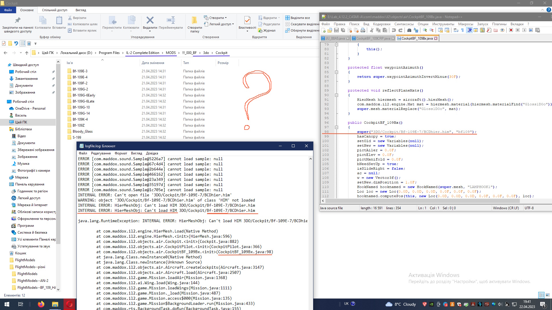 Однако, есть небольшие вопросы. ![]() Можно ли отдельно выложить кокпиты для ранних Мессеров? В моде их пока нет. ![]() Загрузил Берту-2 в миссии, показывет небо, нажал обзор со стороны - Берта стоит на полосе, на нажатие открыть фонарь или запустить мотор не реагирует. Выключил Ил и открыл лог-файл почитать - он ругается на невозможность прочитать хиер-хим и номер ошибки в классе. Посмотрел нотепадом в классе строку ошибки - там укаана ссылка на размещение хиер-хима. Открыл папку модом, а внутри папку с кокпитами. Требуемой папки кокпита там не оказалось, поэтому и не загрузился сам кокпит - его нет в 3До. ![]() С удовольствием подключусь для коррекции классов, если где то что то не "срастается".