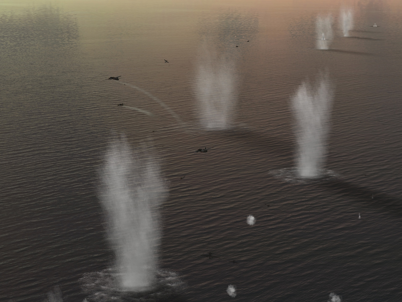 Для достижения лучшей естественности эффектов взрывов на воде пришлось объединить два эффекта , а именно: