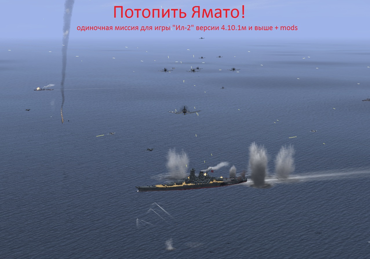 Делал на 4.10.1, но думаю, прекрасно пойдёт и на 4.11. Из модов требуется только "Ямато"(качал по ссылке отсюда)http://forum.aviaskins.com/showpost....&postcount=145В реале японское соединение атаковало 227 самолётов(остальные либо заблудились и не вышли на цель, либо опоздали). В игре только 97, но и их "с головой" хватает. Главной трудностью при создании миссии было сделать так, чтоб его не "убили" слишком быстро . ИМХО, надо бы добавить ему прочности. Просто распакуйте в одиночные миссии и летайте на здоровье!