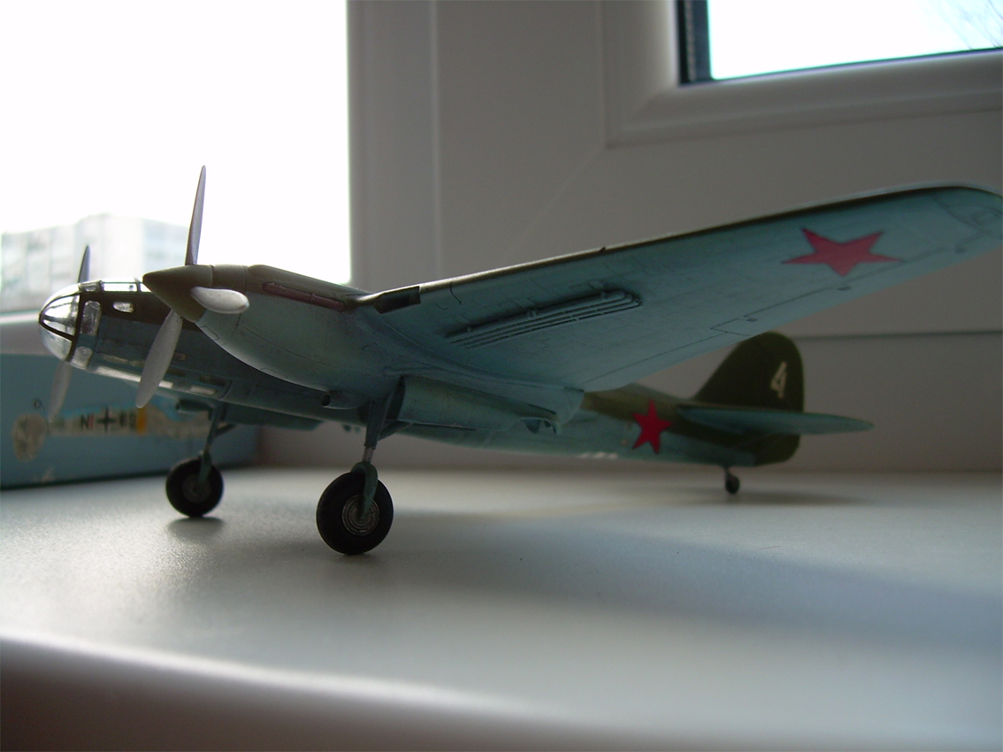 Хм, мне этот АР-2 до боли напоминает СБ-2, который я как раз собираю сейчас. В смысле, схема покраски такая же, и "четверка" на киле, впечатление, что с одного декаля. Куча вопросов: - Движущиеся детали есть? (я сейчас ломаю голову, как на своем СБ сделать сдвижные фонари кабин, а стрелковую установку уже сделал крутящейся). - Переплет фонарей на АР-2 красился в цвет, "кузова" так сказать? - Этот АР-2 какой-то конкретный исторический, или абстракция? - Как ты делал границы между зеленой и синей частями окраски? - Или это все же не декаль, звезды и четверка? Поясню, в собирании моделей самолетов я новичок, потому могу задавать "чайницкие" вопросы
