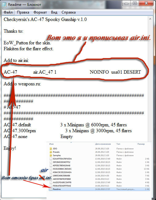 С-47 как прописывал в air.ini. Некоторые сам. ставятся без проблем т.к. Ил-4, Ю-88 тор., У-2, В-29, Р-5 прямо встали и редактор их видит и в малом редакторе их видно, а другие и в air.ini их прописывал и в plane_ru прописываю и weapons_ru тоже прописываю и не хотят показыватся в редакторе игры. Что это не пойму, где ещё что надо прописать ?????????
