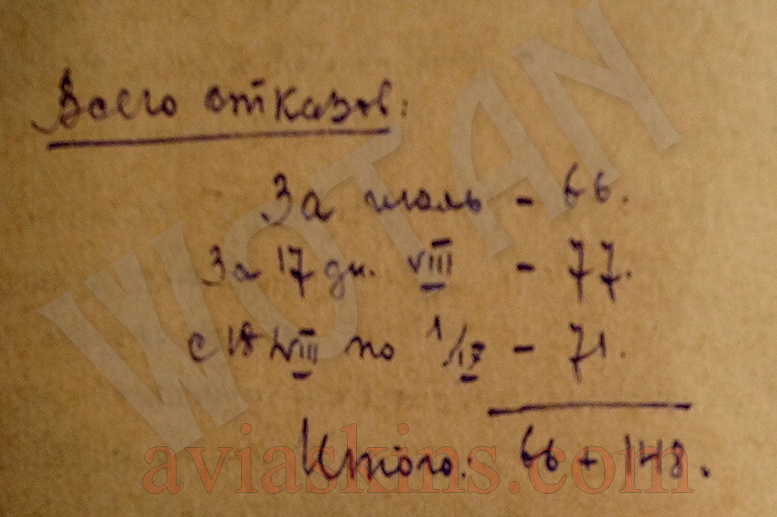 Это отчёты о работе завода и Военного Представительства ГУВВС КА, ст. военпреда завода №1 военинженера 2 ранга Францева начальнику 2-го отдела 10-го управления ГУВВС КА военинженеру 1 ранга Алексееву, директору завода №1 Третьякову, а также ст. военпреду завода №24. Там вообще много всяких подробностей по дефектам, написано, сколько заводских бригад и каким составом, работают в строевых частях по восстановлению мат-части. Жалоба на то, что систематически повторяющиеся дефекты так и не устраняются, при этом видно, что дефект с плохой приемистостью мотора и тряской, за месяц вырос в два раза и т.д. Отдельные листы облёта на конкретные самолёты. Всё конечно выкладывать нельзя, но вот пример из повторной сдачи МиГа №4371. Его несколько дней пытались облетать разные лётчики, и каждый раз в заключении одно и тоже (ППЦ), один раз закончилось вынужденной посадкой.