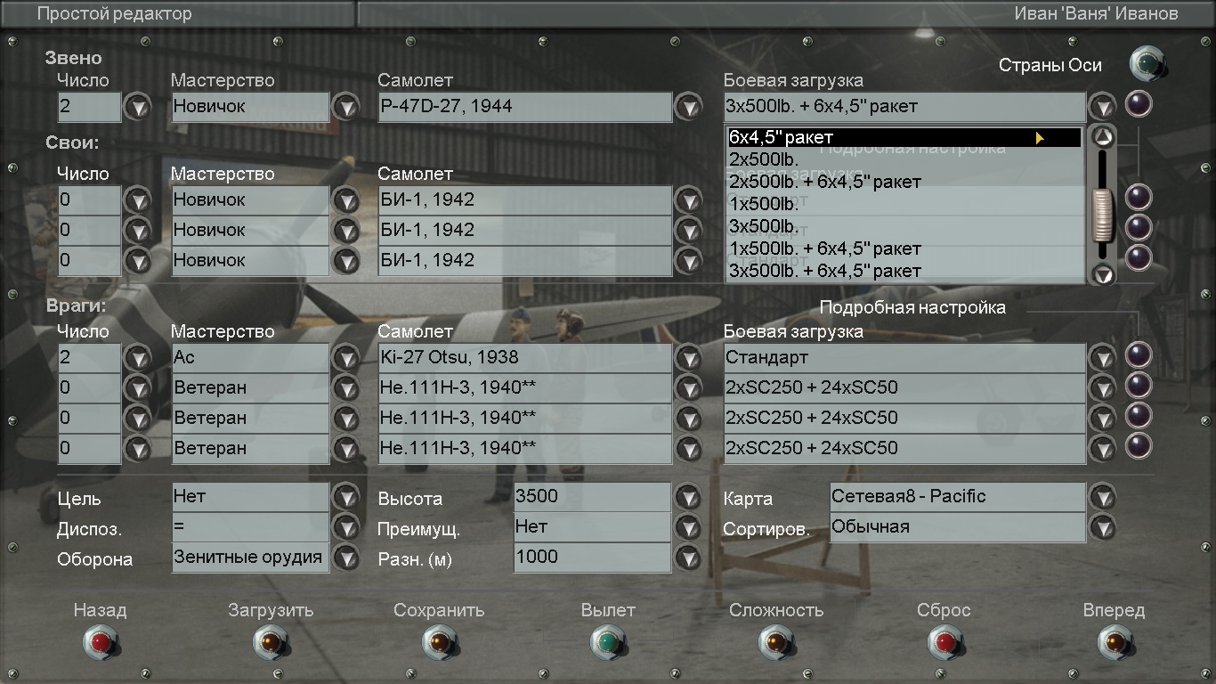 Столкнулся с тем, что бомбовая нагрузка на Р-47D-27 в Ил-2 (скрин прилагается) отличается от нагрузки прописанной в ALLWEAPON: P_47D27;5000;5000;0;0;0;0;0;0;1;1;1;0;0;1;0;0;0;0; 0;default;All P_47D27;5000;5000;0;0;0;0;0;0;0;0;0;0;0;0;0;0;0;0; 0;none;All P_47D27;5000;5000;0;0;0;0;0;0;1;1;1;0;0;1;0;0;0;0; 0;overload;All P_47D27;5000;5000;0;0;0;0;0;0;1;1;1;0;0;1;0;0;1;0; 0;tank;All P_47D27;500;500;1;1;1;1;1;1;0;0;0;0;0;0;0;0;1;0;0; tank2x500;All P_47D27;500;500;1;0;1;0;0;0;0;0;0;0;0;0;0;0;1;0;0; tank6x45;All P_47D27;500;500;1;1;1;1;1;1;0;0;0;0;0;0;0;0;1;0;0; tank2x5006x45;All P_47D27;500;500;1;0;1;0;0;0;0;0;0;0;0;0;0;0;0;0;0; 6x45;All P_47D27;500;500;1;1;1;1;1;1;0;0;0;0;0;0;0;0;0;0;0; 2x500;All P_47D27;500;500;1;1;1;1;1;1;0;0;0;0;0;0;0;0;0;0;0; 2x5006x45;All P_47D27;500;500;1;1;1;1;1;1;0;0;0;0;0;0;0;0;0;0;0; 1x1000;All P_47D27;500;500;1;1;1;1;1;1;0;0;0;0;0;0;0;0;0;0;0; 1x10002x500;All P_47D27;500;500;1;1;1;1;1;1;0;0;0;0;0;0;0;0;0;0;0; 1x10006x45;All P_47D27;500;500;1;1;1;1;1;1;0;0;0;0;0;0;0;0;0;0;0; 1x10002x5006x45;All P_47D27;500;500;1;1;1;1;1;1;0;0;0;0;0;0;0;0;0;0;0; 2x1000;All А именно: в игре нет прописанных в указанном файле подвесов с 1-ой 1000-кг бомбой, а в файле 1 и 3 500-кг бомб. Подозреваю, что именно из-за этого происходит подрыв самолетов на аэродроме в моей кампании. Я прав и тут какая-то ошибка, или я что-то не понимаю? |