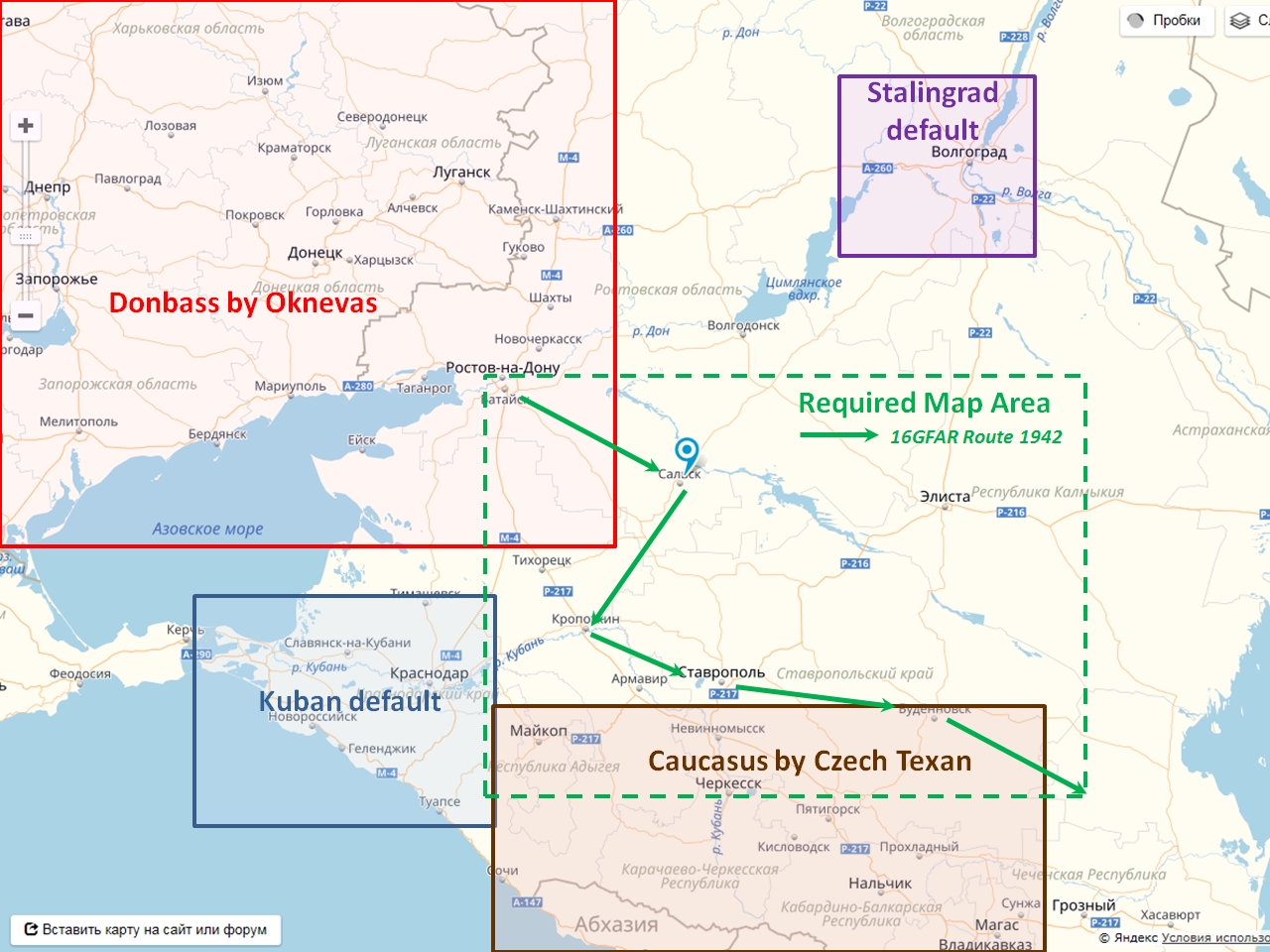 Уважаемые коллеги, возможно, кого-то из картоделов это вдохновит (см. скриншот New Map Idea.jpg)? Над этим обведенным зеленым пунктиром участком в июле-августе 1942 года пролегал боевой путь 16-го ГвИАП и других авиачастей, участвующих в Северо-Кавказской оборонительной операции. А если расширить эту область на север до южного берега Цимлянского водохранилища, получим в придачу боевой путь 9-го ГвИАП в феврале-марте 1943 года, по которому они гнали оккупантов от Сталинграда до Котельниково и Ростова. Да и другие авиачасти там тоже воевали. Может быть, есть смысл начать хотя бы с поиска материалов? Глядишь, и родится у кого-то шедевр.